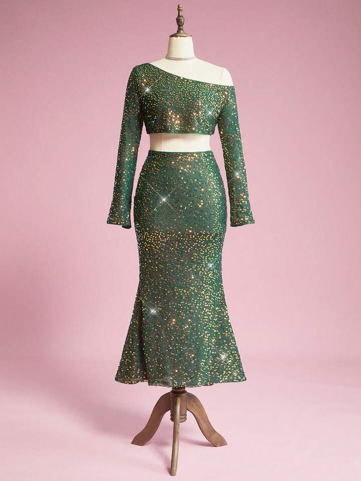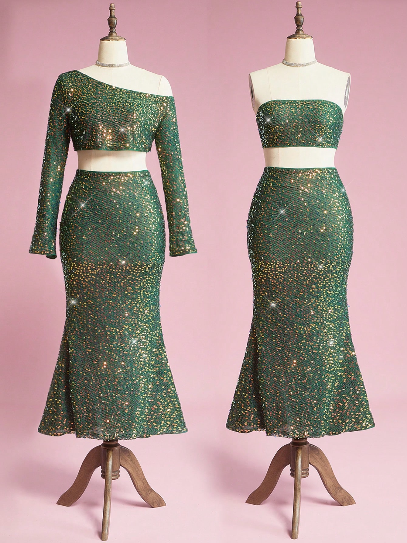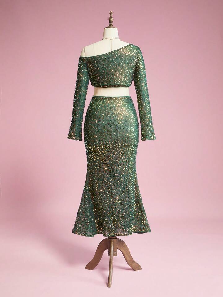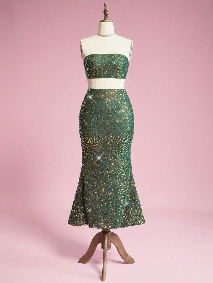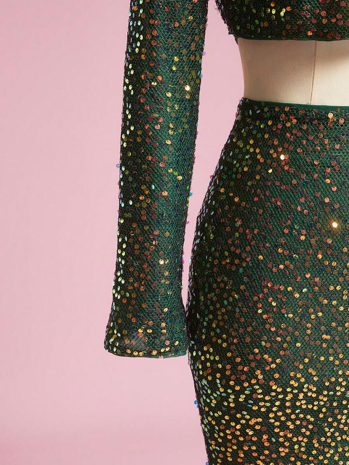 ROMWE Avant 2 pezzi Set di top corto e gonna a sirena con ricamo e paillettes, stile vacanziero e sexy per donna