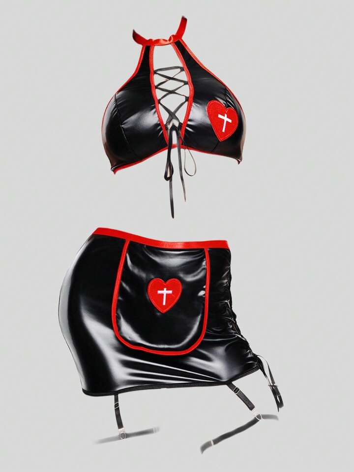 ROMWE Avant 3 pezzi Set di lingerie costume da infermiera punk scuro, sexy, per Ognissanti