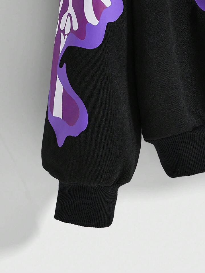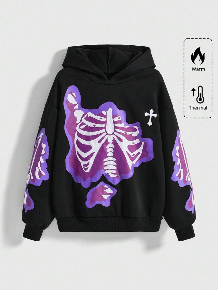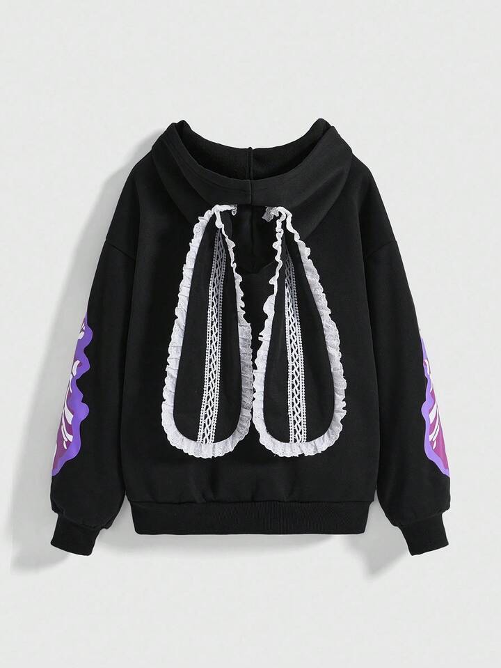 ROMWE Avant Felpa con cappuccio in pizzo con motivo scheletrico bizzarro e orecchie da coniglio, vestibilità morbida