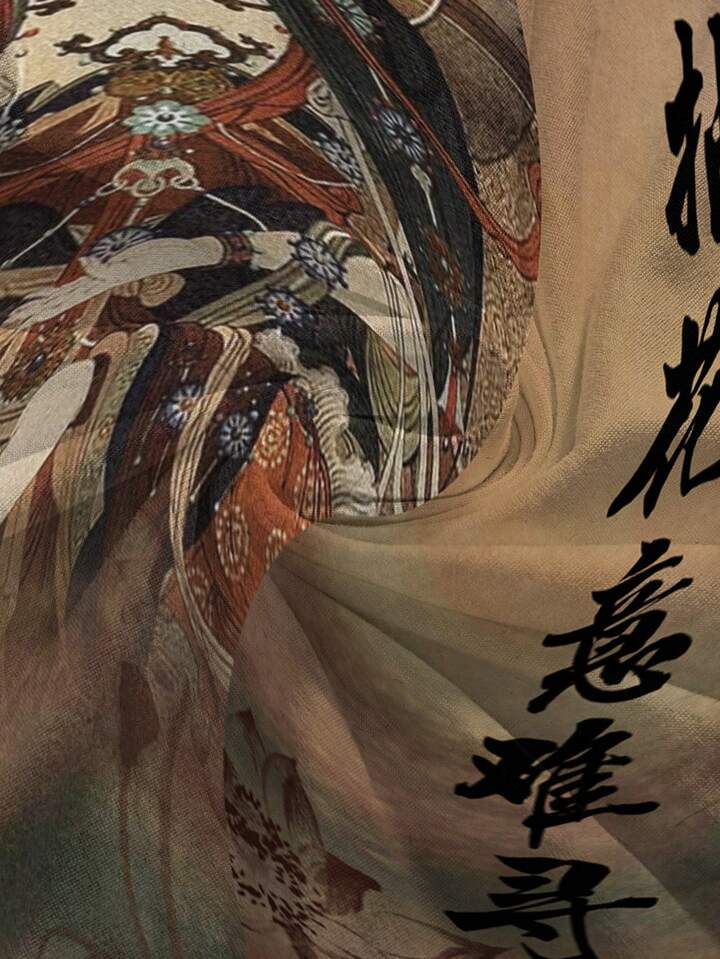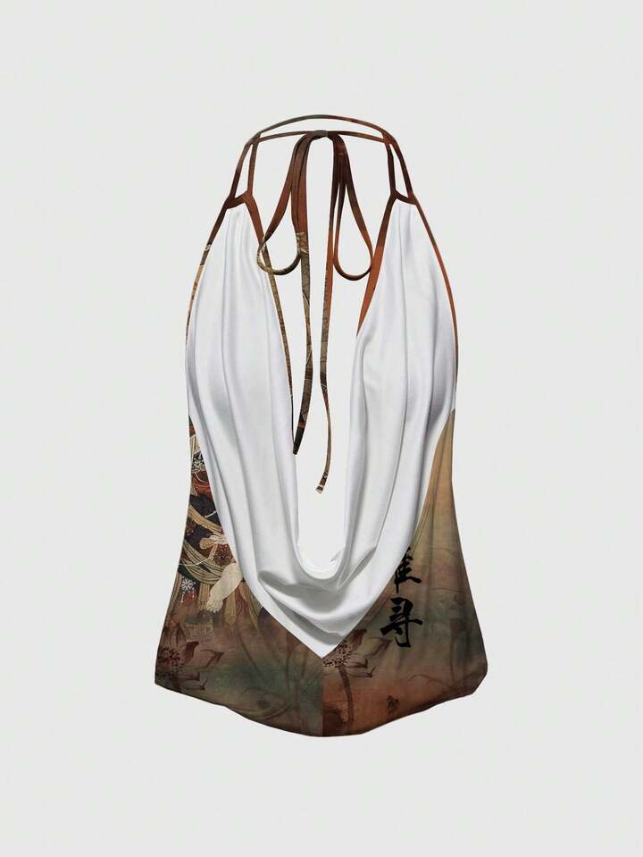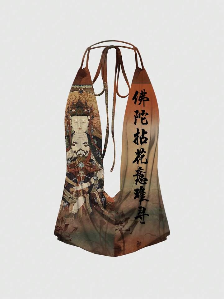 ROMWE Avant Canotta donna stile cinese con scollo alla halter, senza schienale, con motivo di loto buddista
