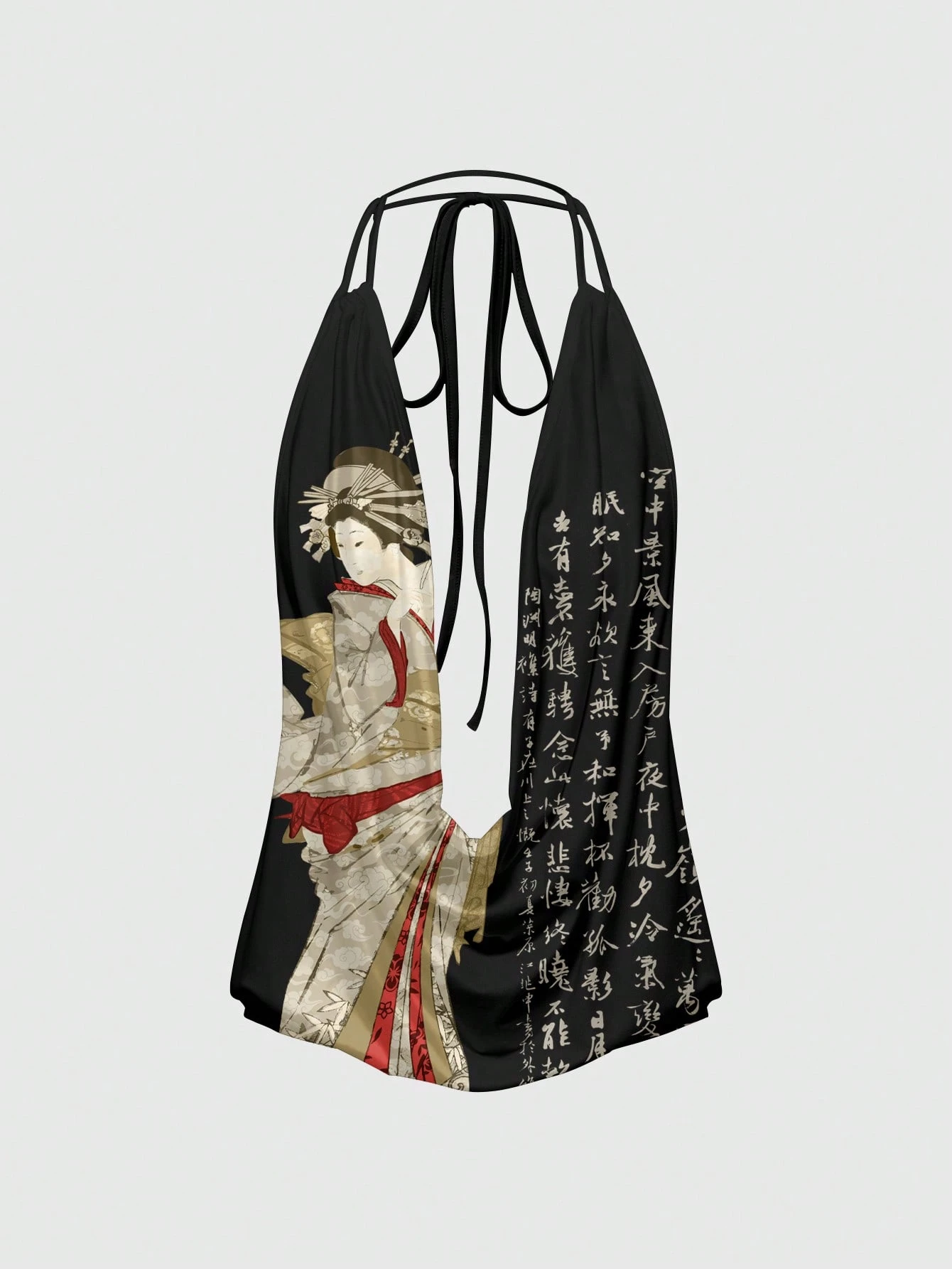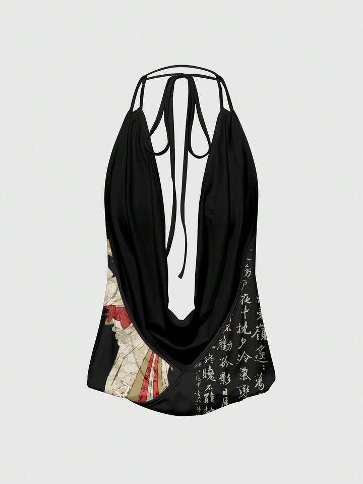 ROMWE Avant Canotta da donna con scollo alla coreana, stile calligrafico cinese, sexy, con lacci e schiena scoperta