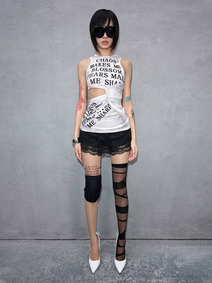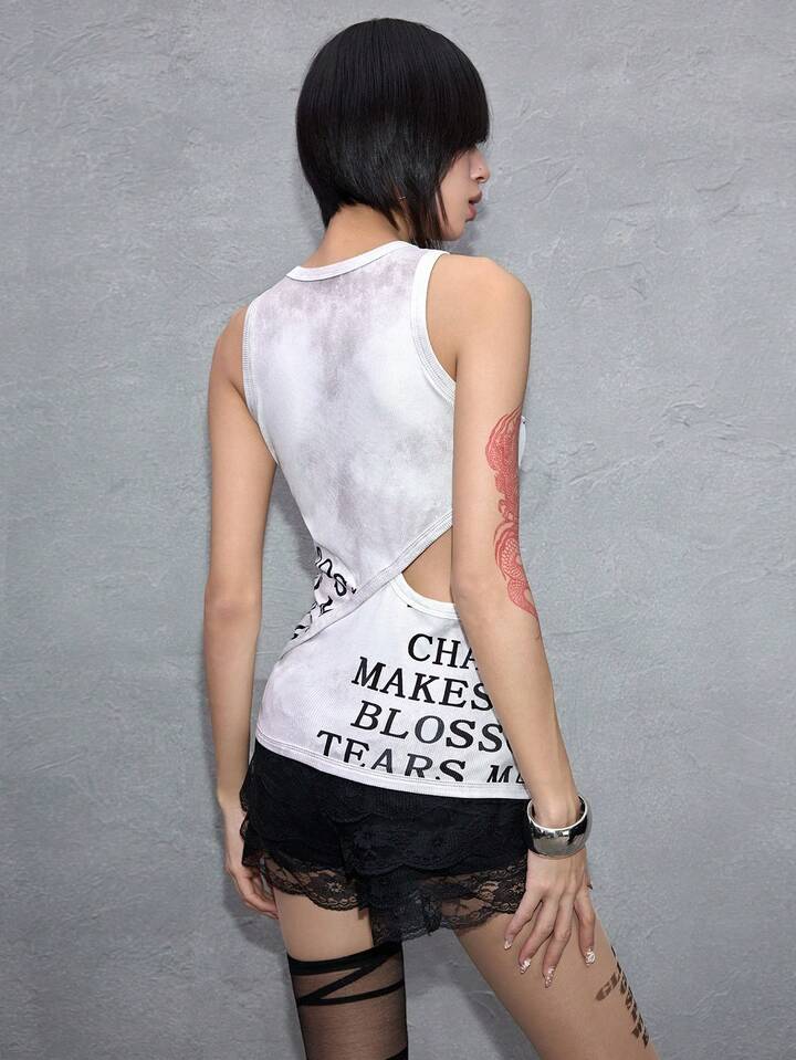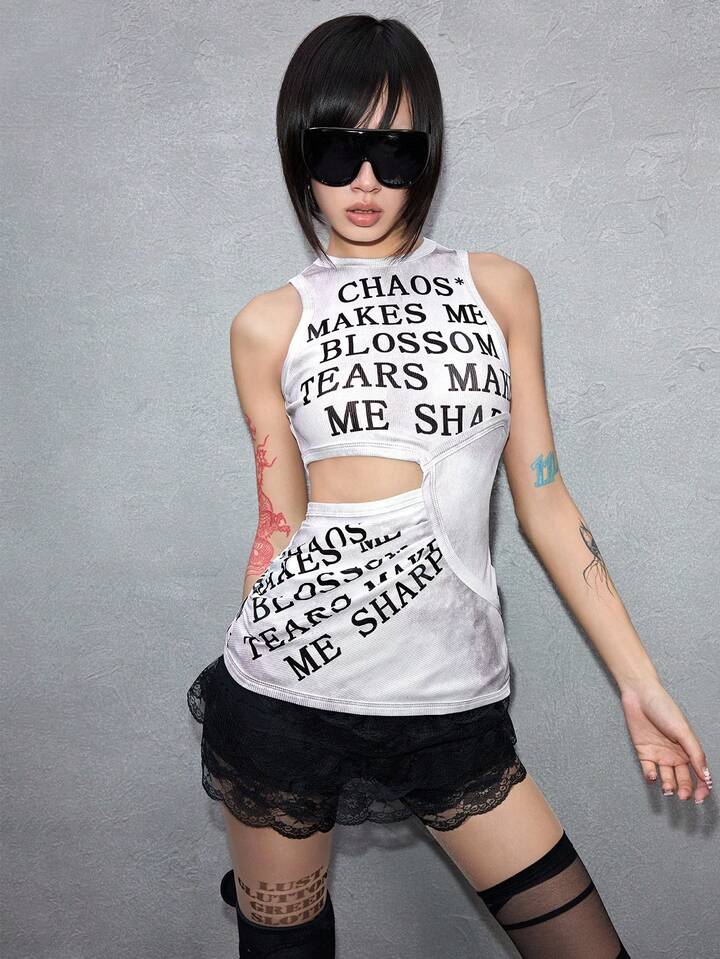 ROMWE Avant Canotta da donna alla moda con stampa in inglese e design traforato