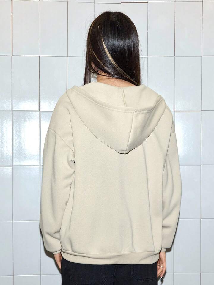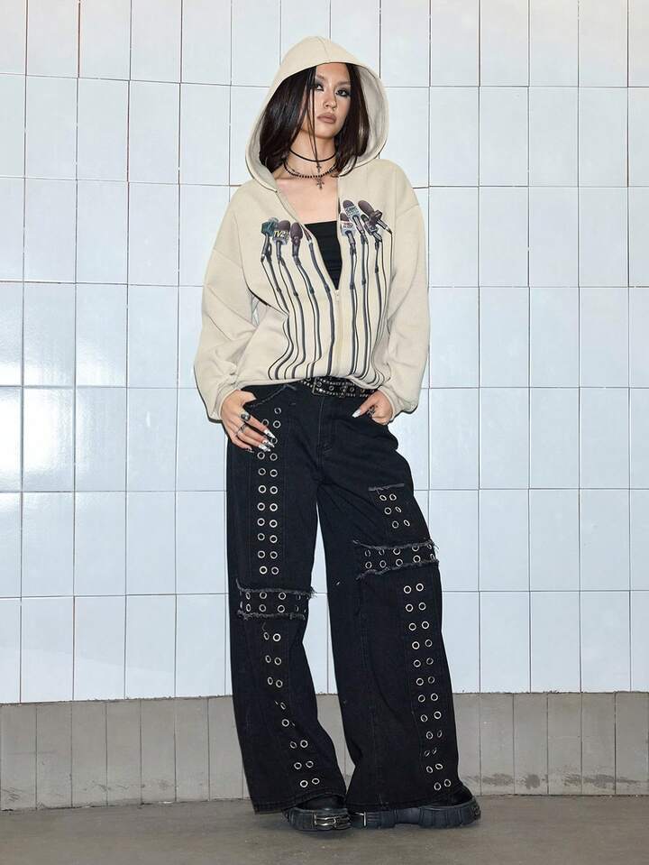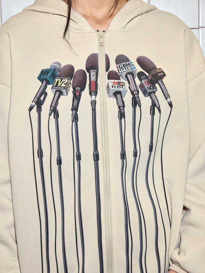 ROMWE Avant Felpa con cappuccio con chiusura lampo e stampa divertente di microfono per simulazione di intervista