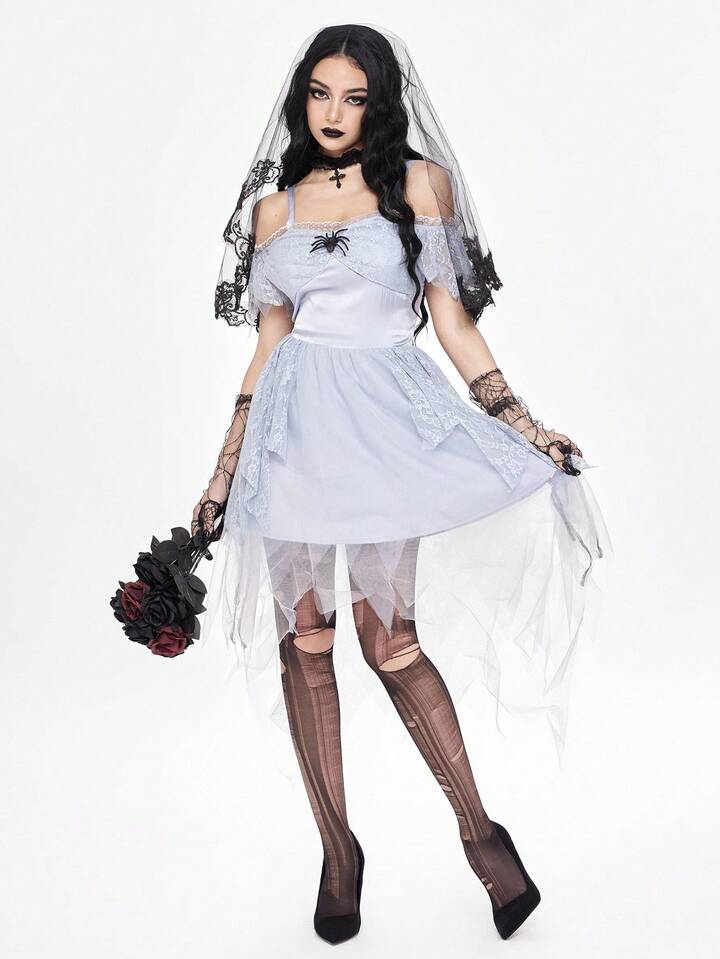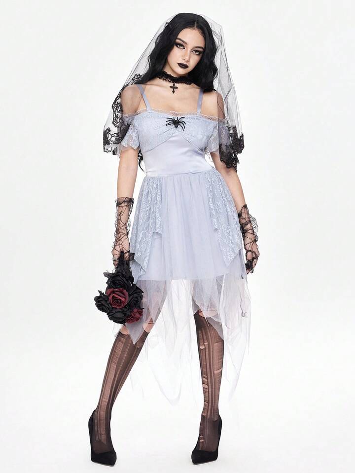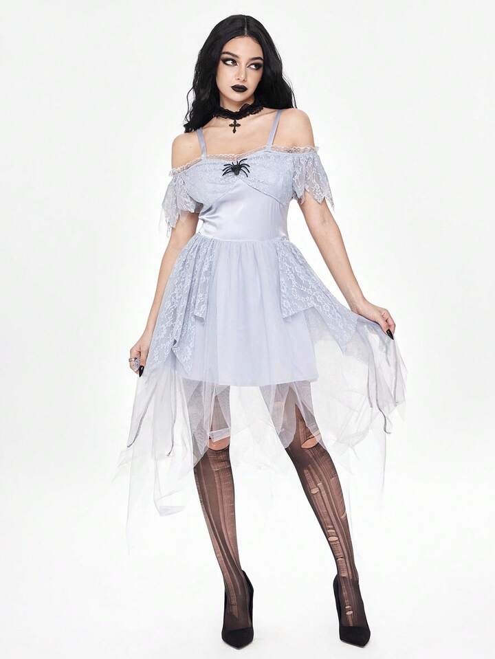ROMWE Avant Vestito in tulle e pizzo con pendente a forma di ragno, costume da sposa per cosplay