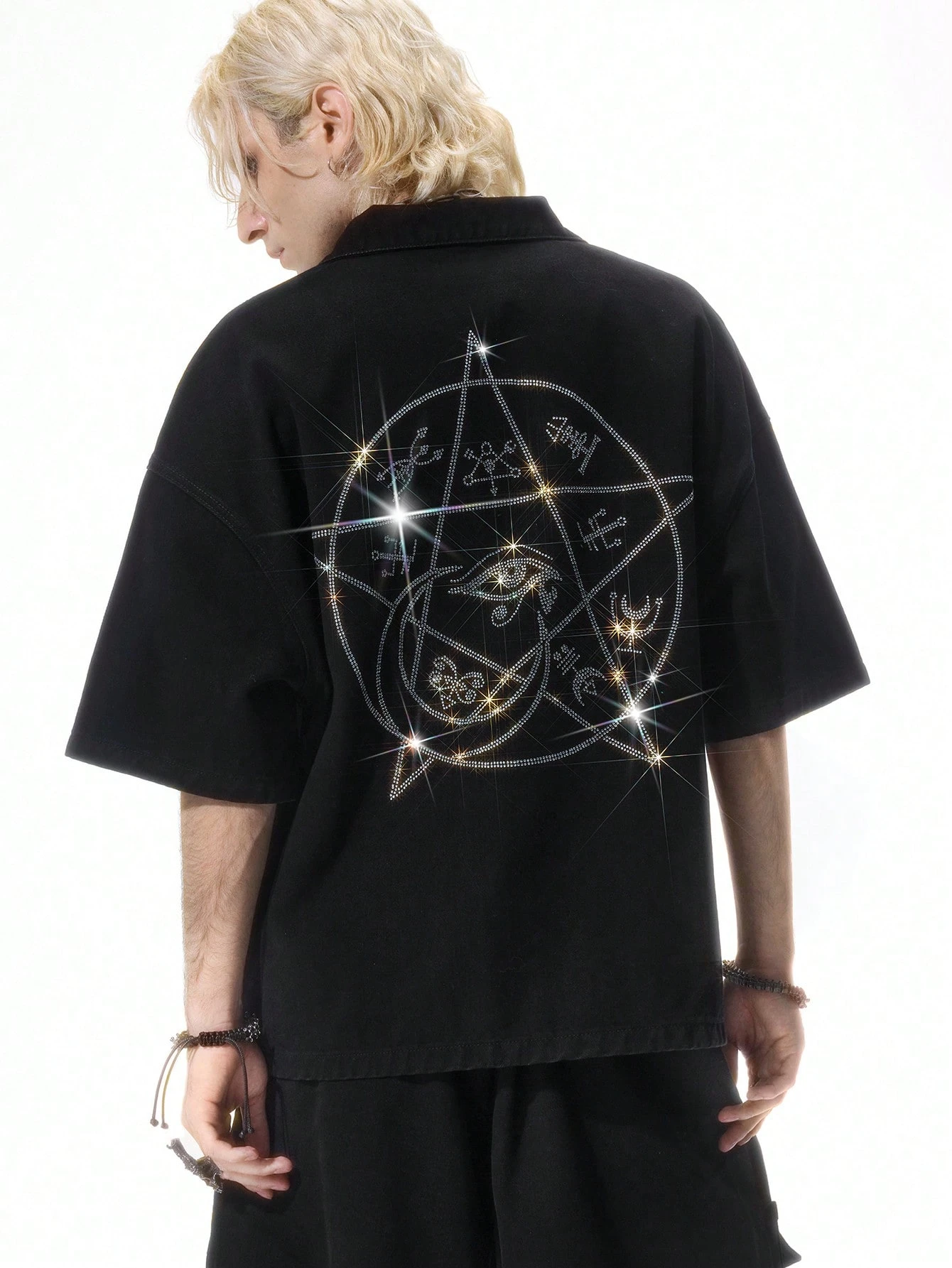 ROMWE Avant Camicia di jeans da uomo alla moda con decorazioni in strass, adatta per l'estate