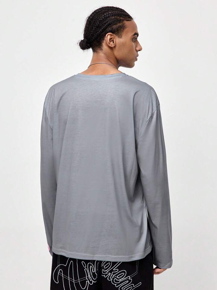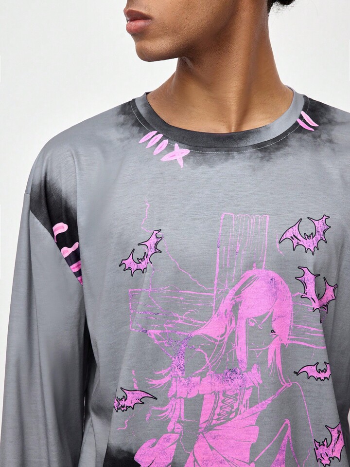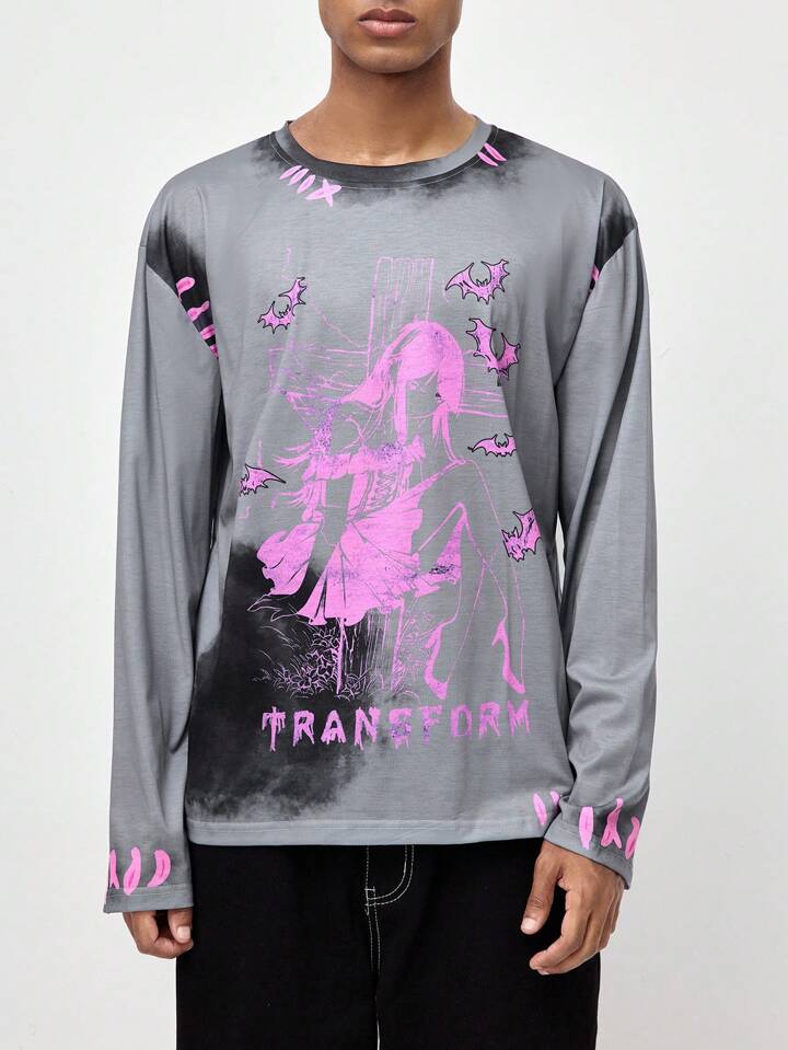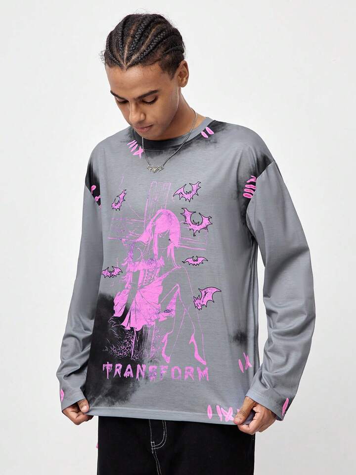 ROMWE Avant Maglietta a maniche lunghe casual con stampe di croci, personaggi dei cartoni animati e lettere, adatta per la scuola, per uomo, primavera e autunno