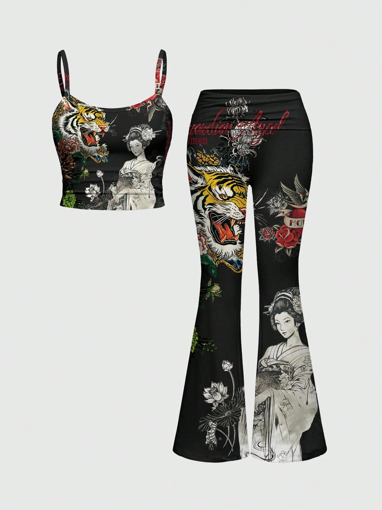 ROMWE Avant Set da 2 pezzi da donna composto da canotta sexy con stampa di tigre, geisha, slogan e crisantemo in stile cinese dark punk e pantaloni a vita bassa a zampa d'elefante, adatto per festival musicali