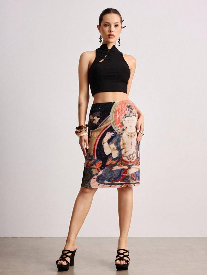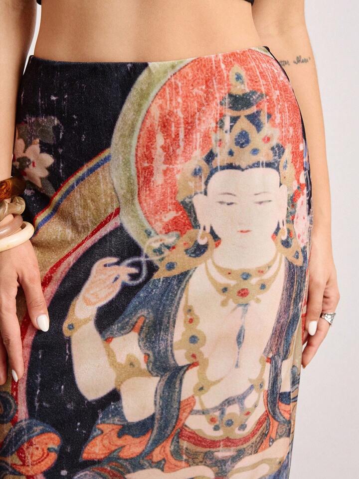 ROMWE Avant Gonna a matita da donna con dipinto estetico orientale di Buddha Thangka