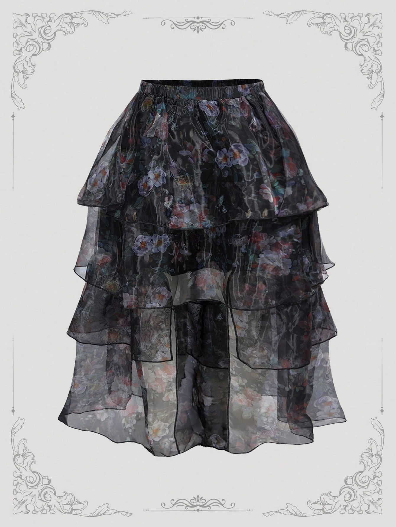 ROMWE Avant Gonna ampia da donna vintage, in organza con stampa floreale, vita arricciata e balze