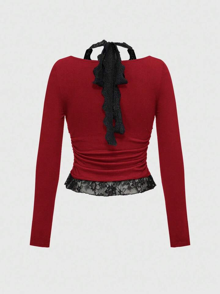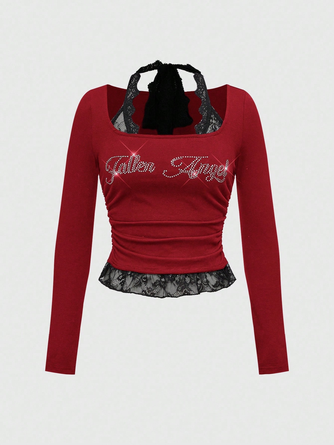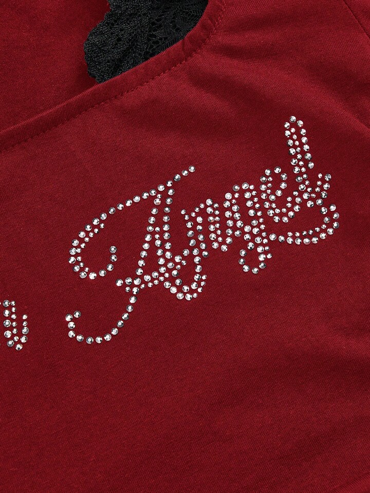 ROMWE Avant T-shirt a maniche lunghe aderente da donna con collo a ciurlo, patch in pizzo e strass con stampa "Punk Bro"