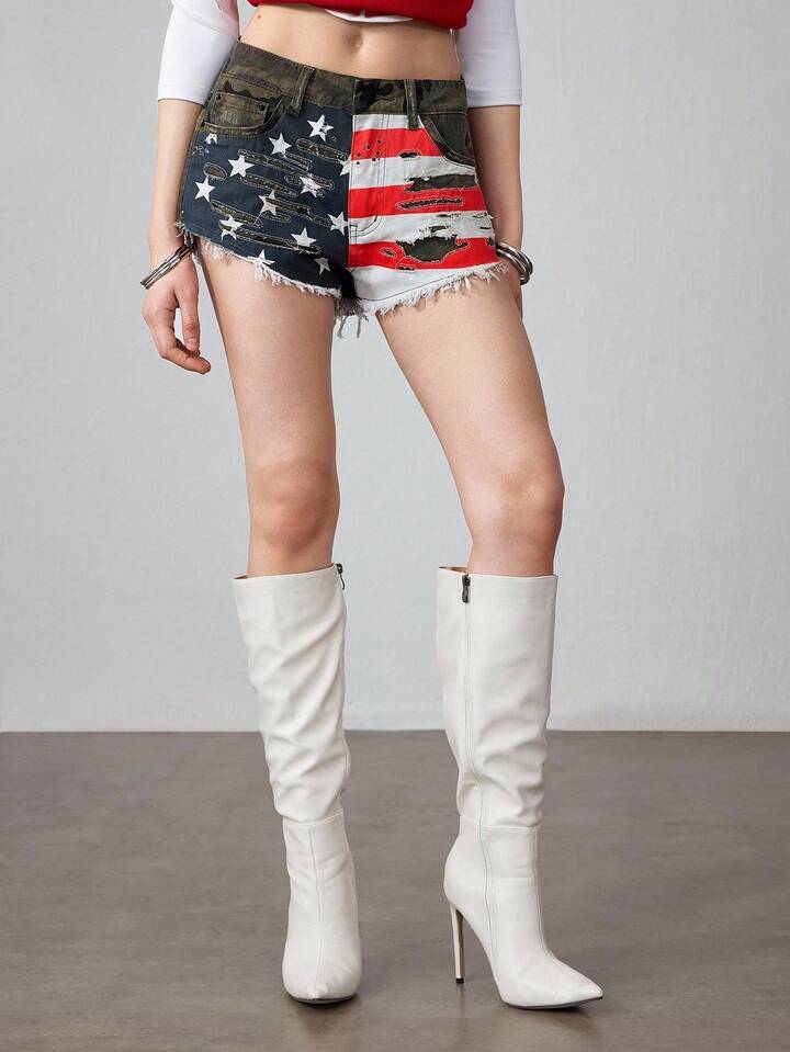 ROMWE Avant Pantaloncini super corti con stampa retrò della bandiera americana e mimetica, effetto consumato