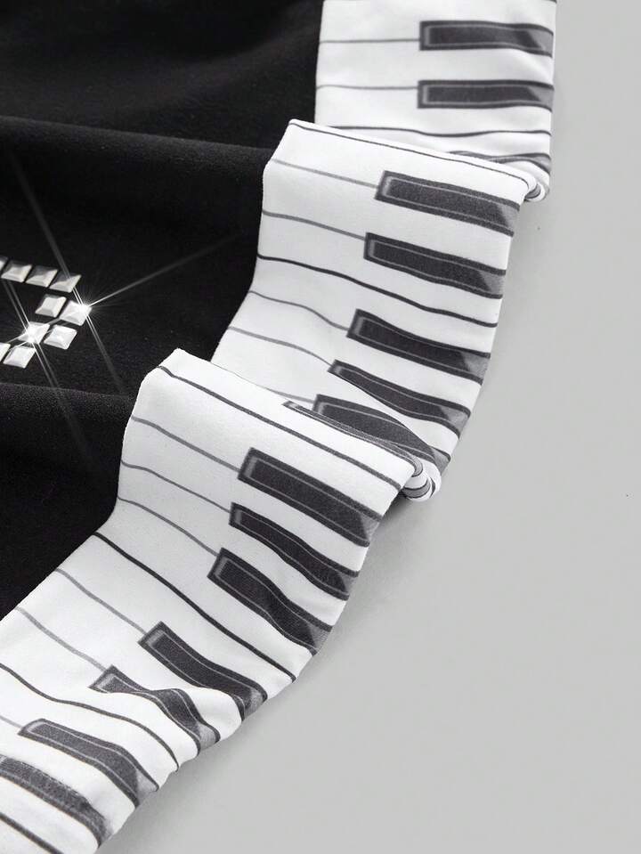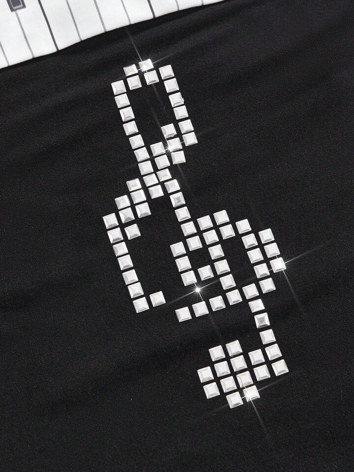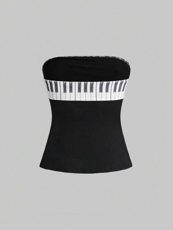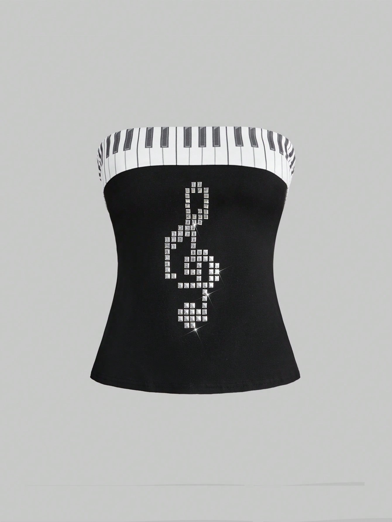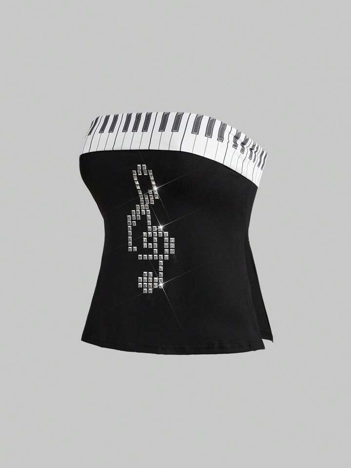 ROMWE Avant Canotta aderente da donna con motivo retrò a tastiera di pianoforte americana, strass e note musicali