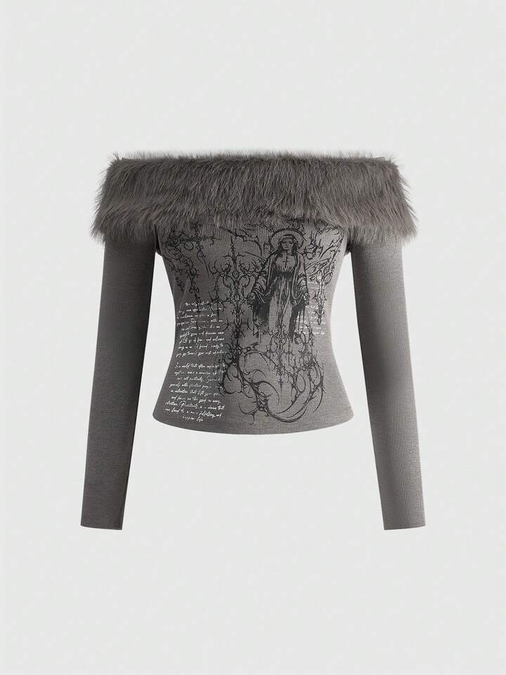 ROMWE Avant Maglietta da donna con stampa lineare di scheletro sexy e Vergine Maria, scollo a spalle scoperte