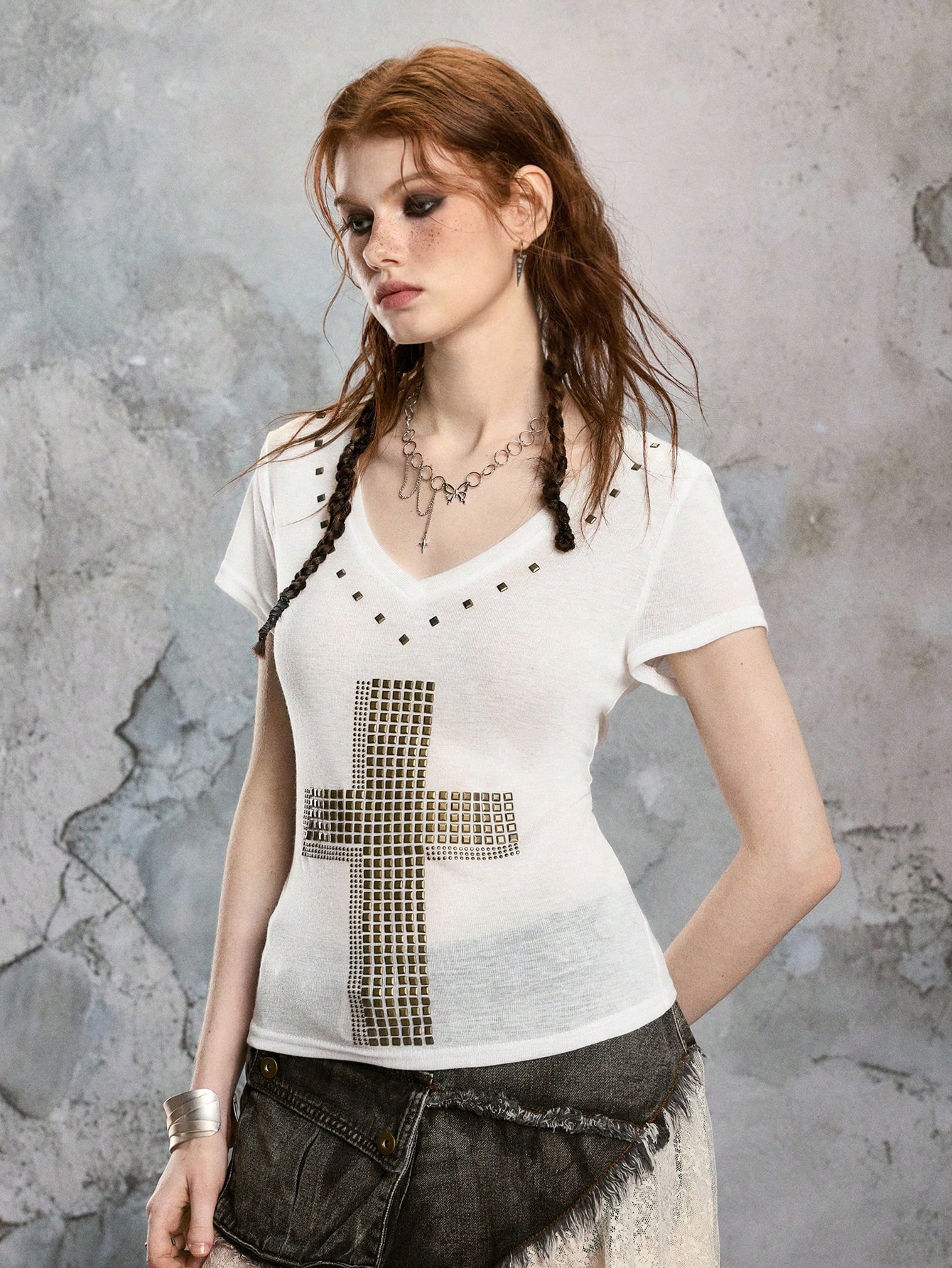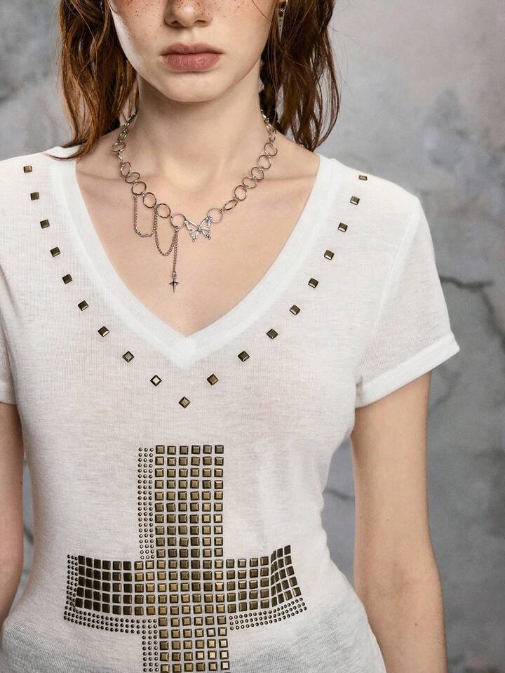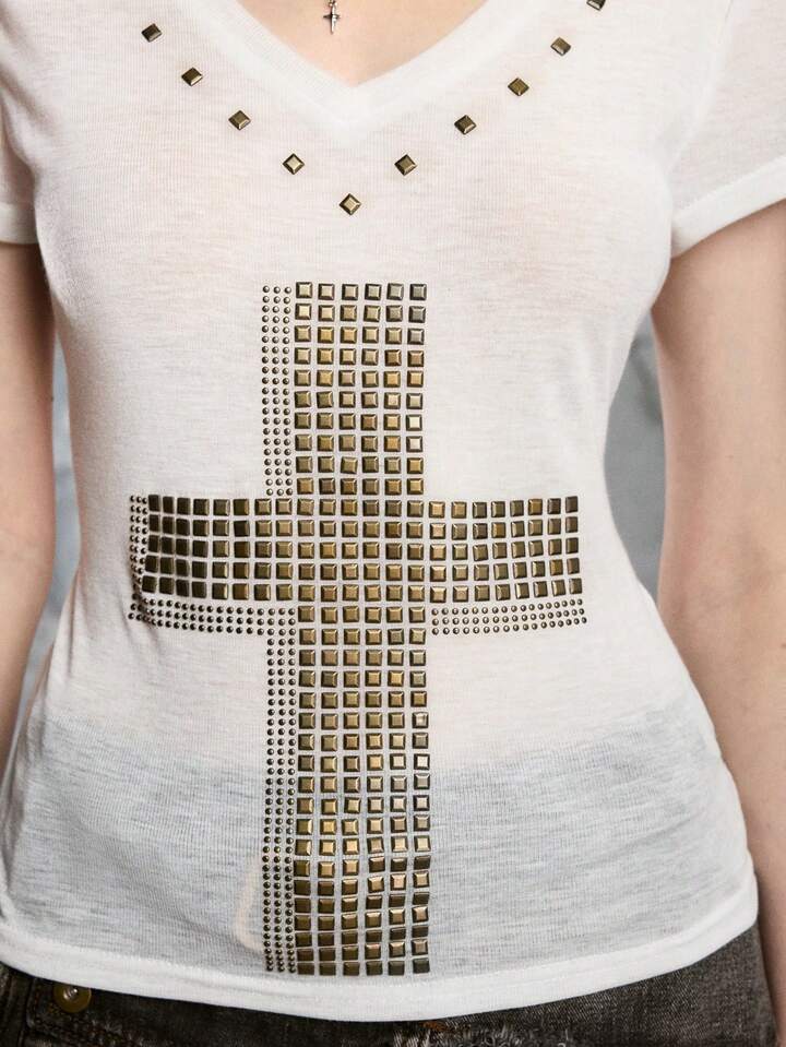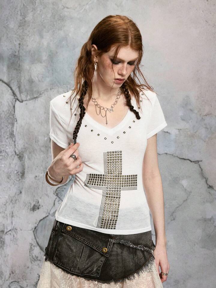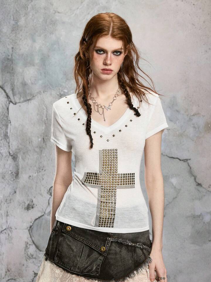 ROMWE Avant Maglietta aderente da donna con scollo a V profondo, trasparente, con grafica a croce, in stile Y2K