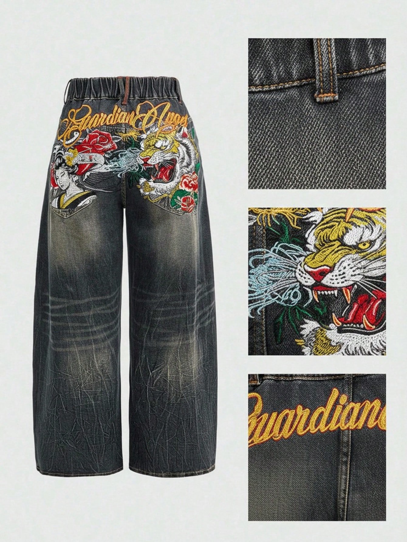 ROMWE Avant Jeans da donna di taglia grande, stile cinese nuovo, con figura ricamata di testa di tigre e geisha, vintage