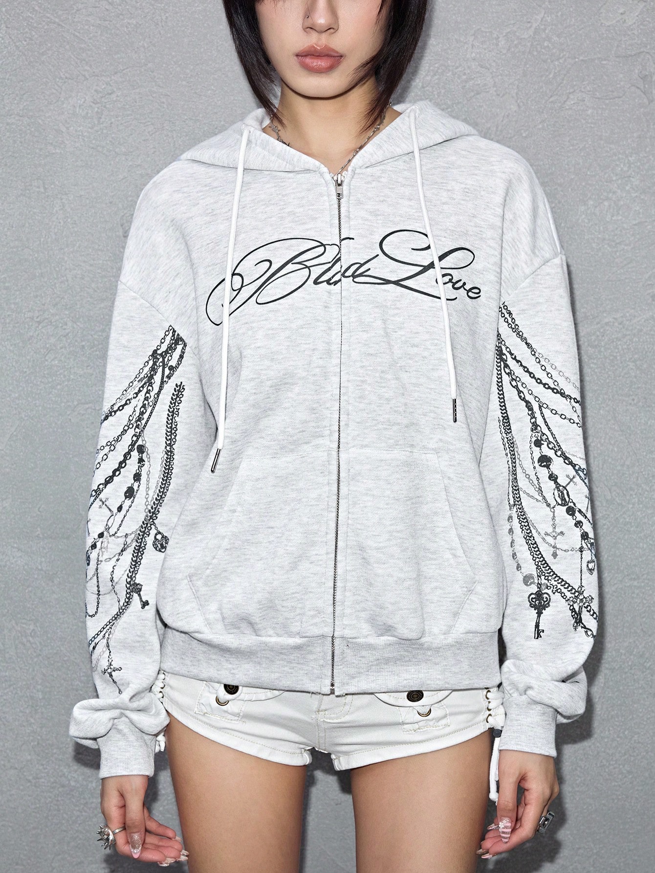ROMWE Avant Felpa grigia leggera con stampa a catena, stile casual da strada, sexy e aperta davanti, per donne