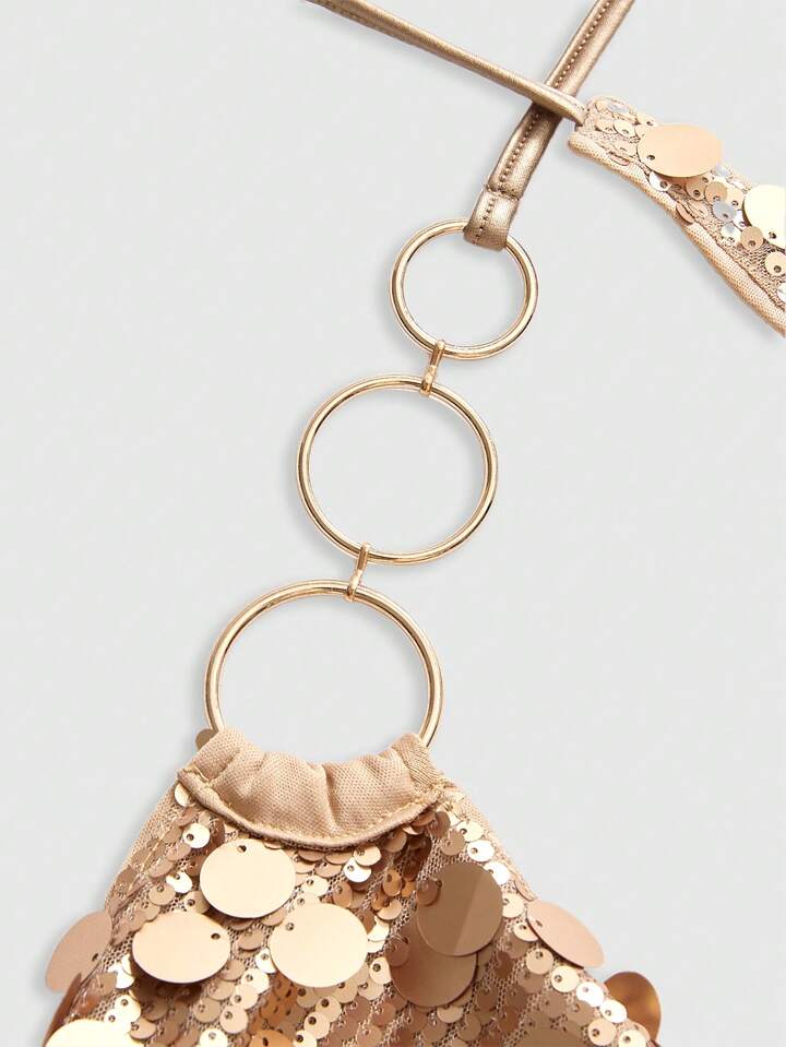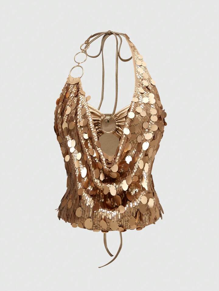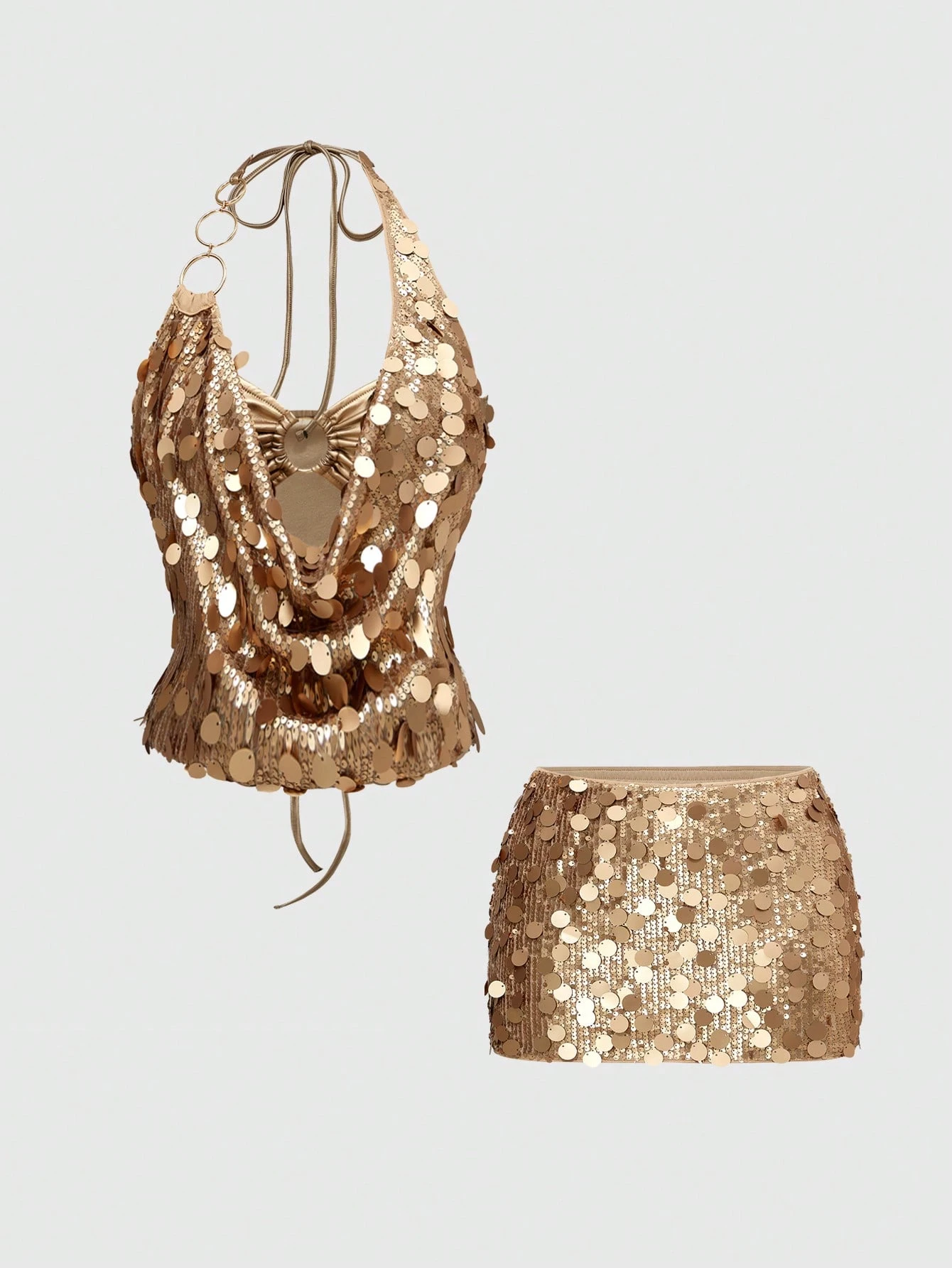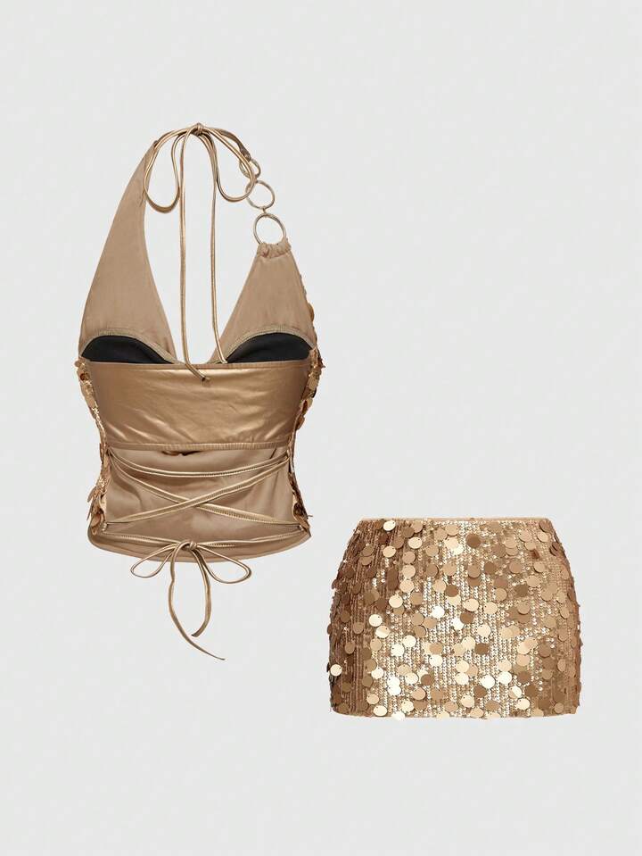 ROMWE Avant Set da 2 pezzi composto da top corto con paillettes e scollo alla halter, e minigonna a vita bassa in stile vintage e sexy Y2K, adatto per feste