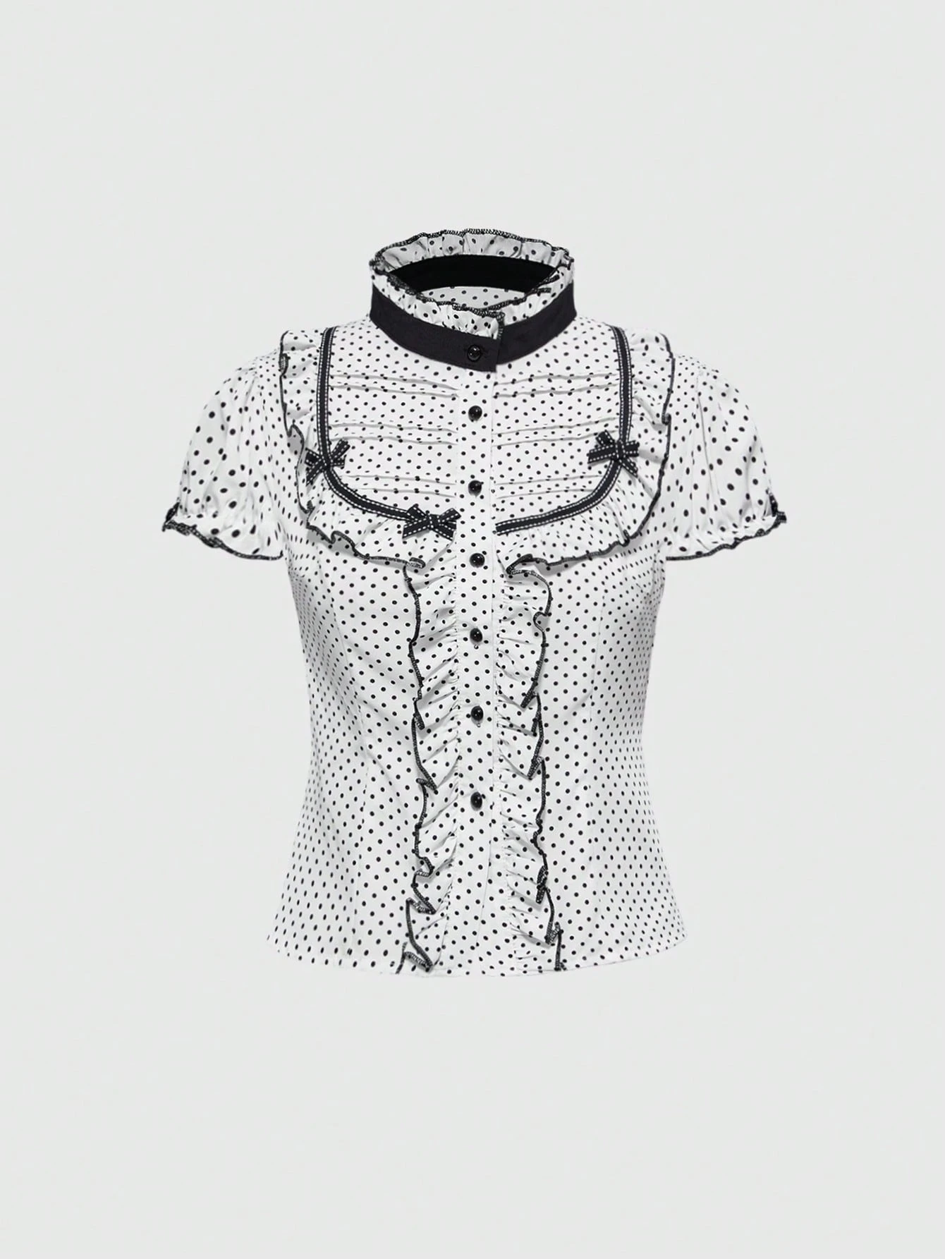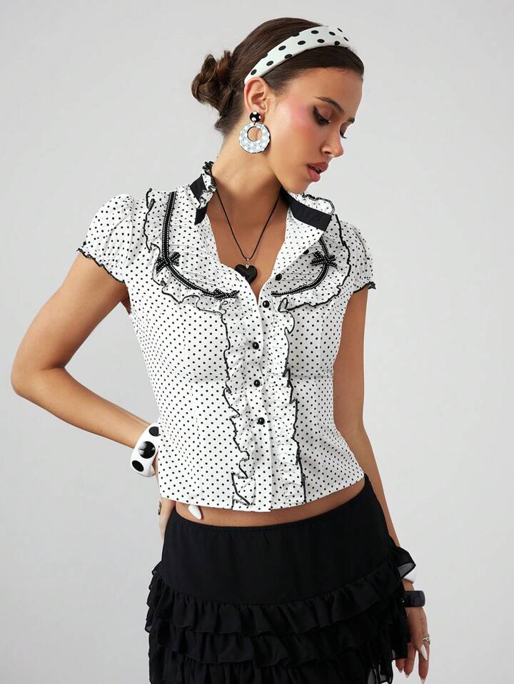 ROMWE Avant Blusa elegante donna con maniche corte, con volant e bottoni sulla parte anteriore, a pois