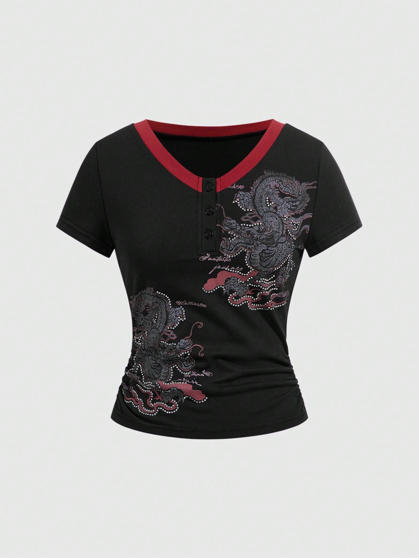 ROMWE Avant Maglietta da donna stile cinese retrò 2 in 1 con stampa di dragone e nuvole, scollo aperto