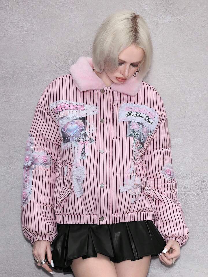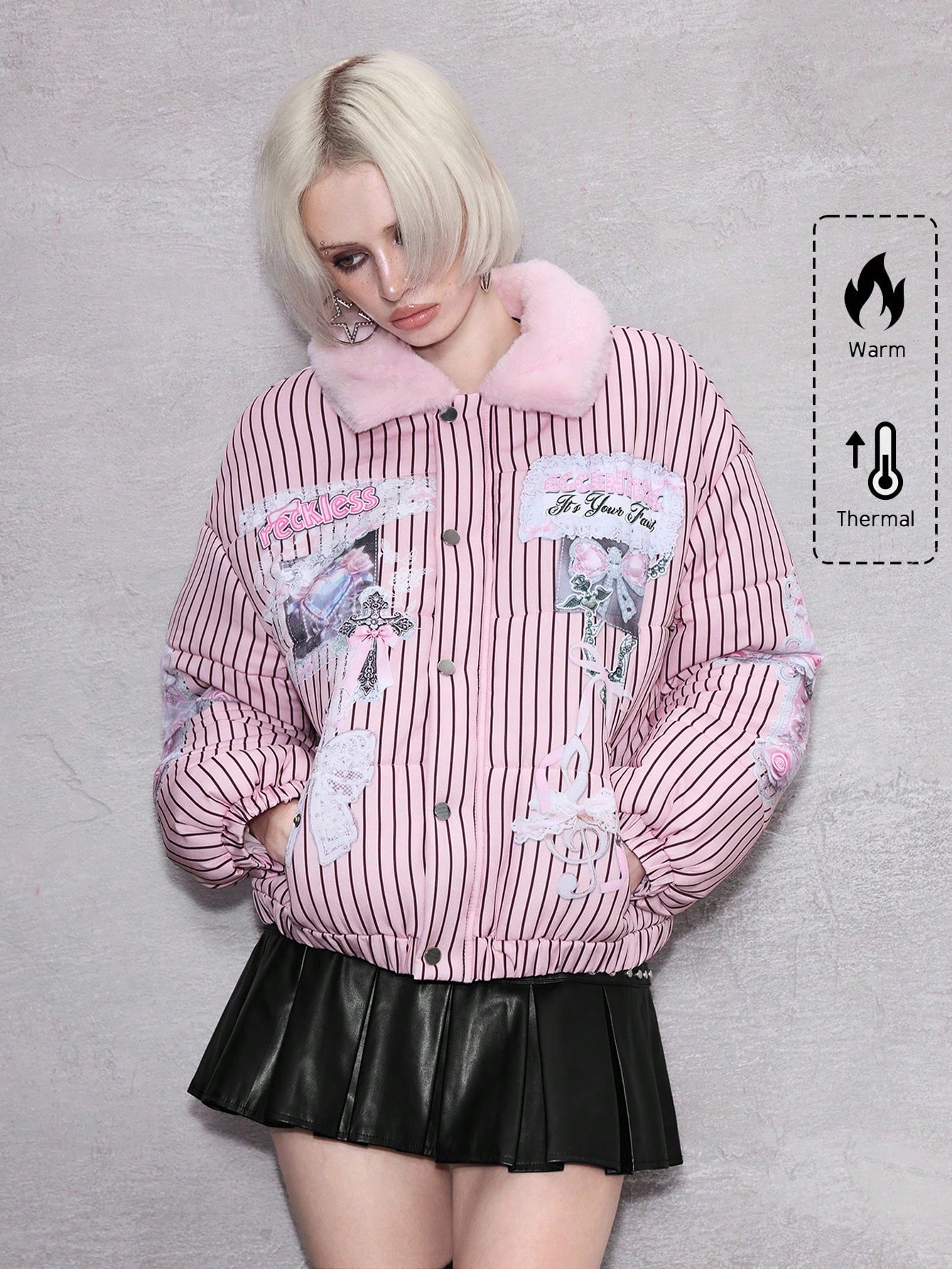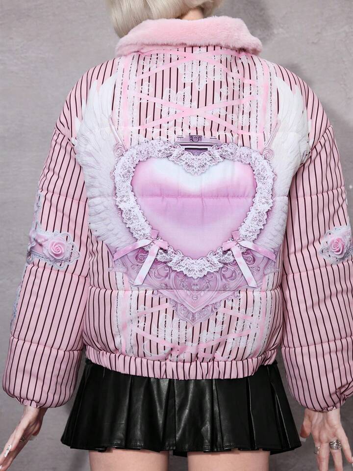 ROMWE Avant Cappotto imbottito in stile retrò, carino e kawaii, con stampa di fiocchi, cuori e ali, in patchwork di tessuto morbido, versatile per le donne