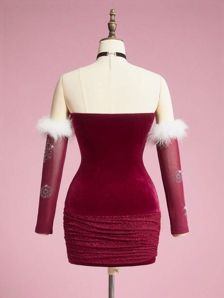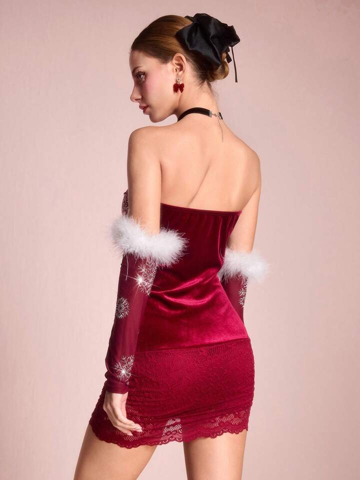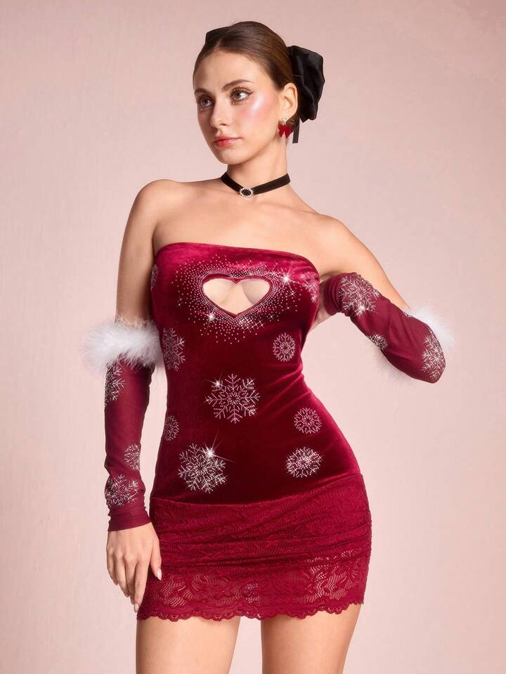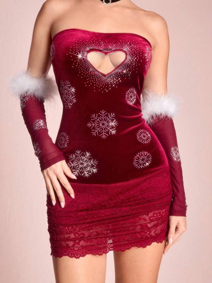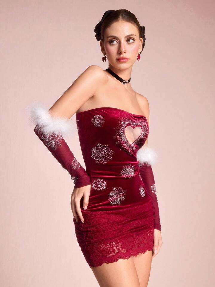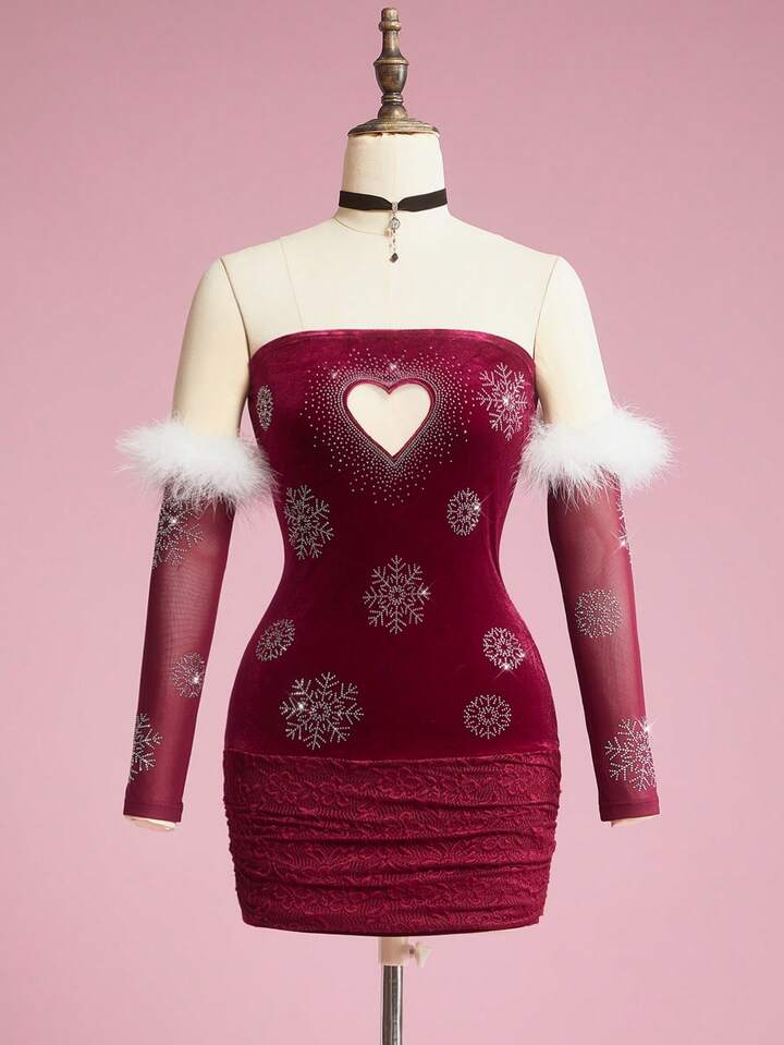 ROMWE Avant Vestito aderente da donna in stile retrò e sexy per feste natalizie, con cuori cavi, fiocchi di neve in strass, maniche in pelliccia e inserti in pizzo