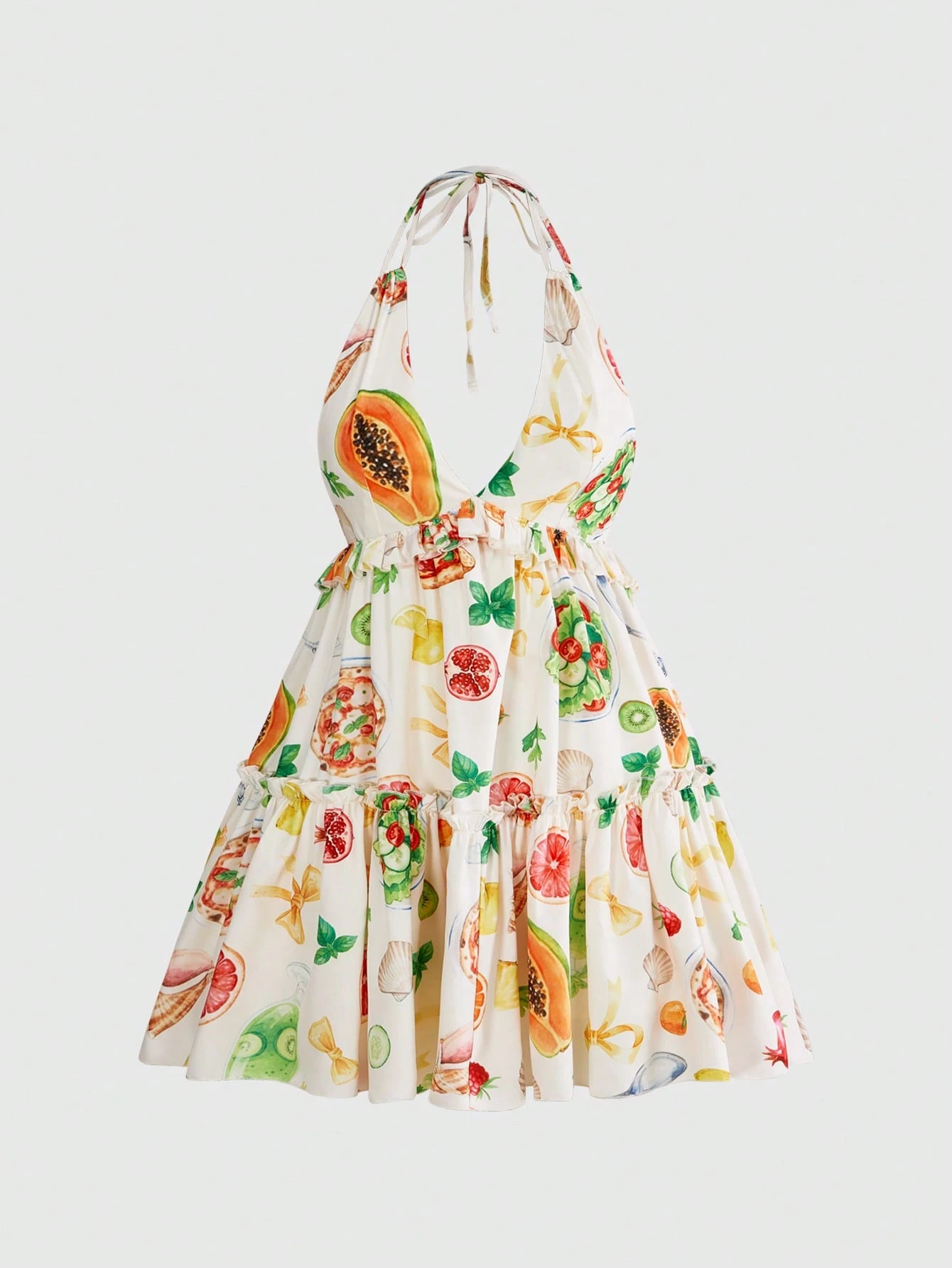 ROMWE Avant Abito mini retrò da donna con scollo a V profondo, stampa di frutta, collo alla halter e balze sul fondo, adatto per le vacanze
