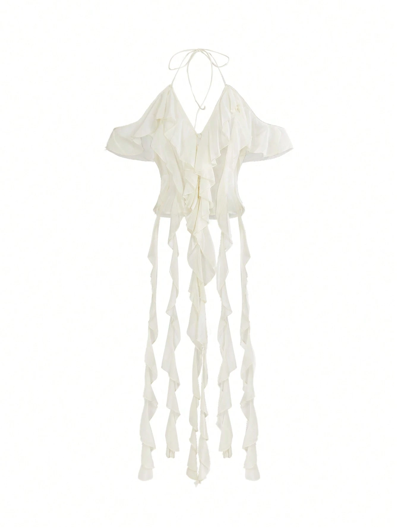 ROMWE Avant Blusa sexy da donna con scollo a volant e orlo arricciato, stile vacanziero