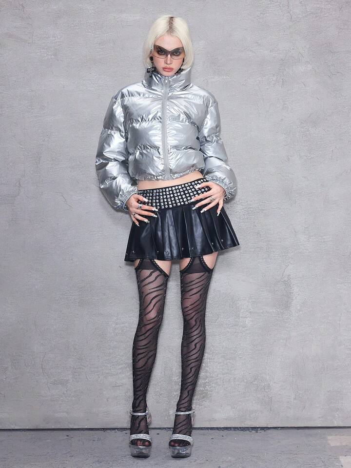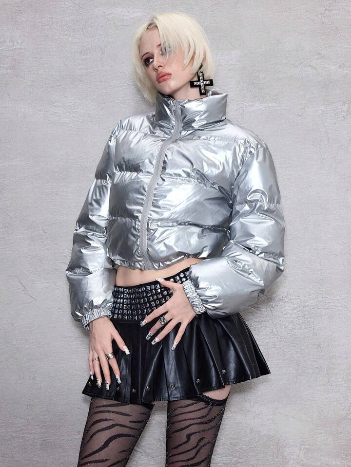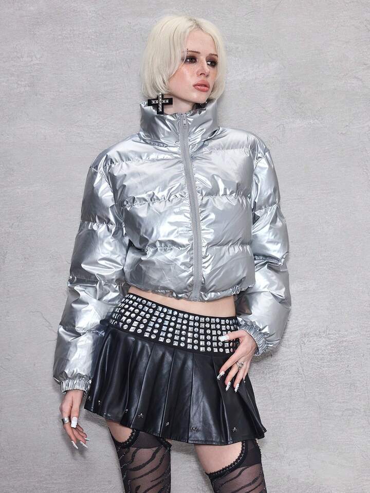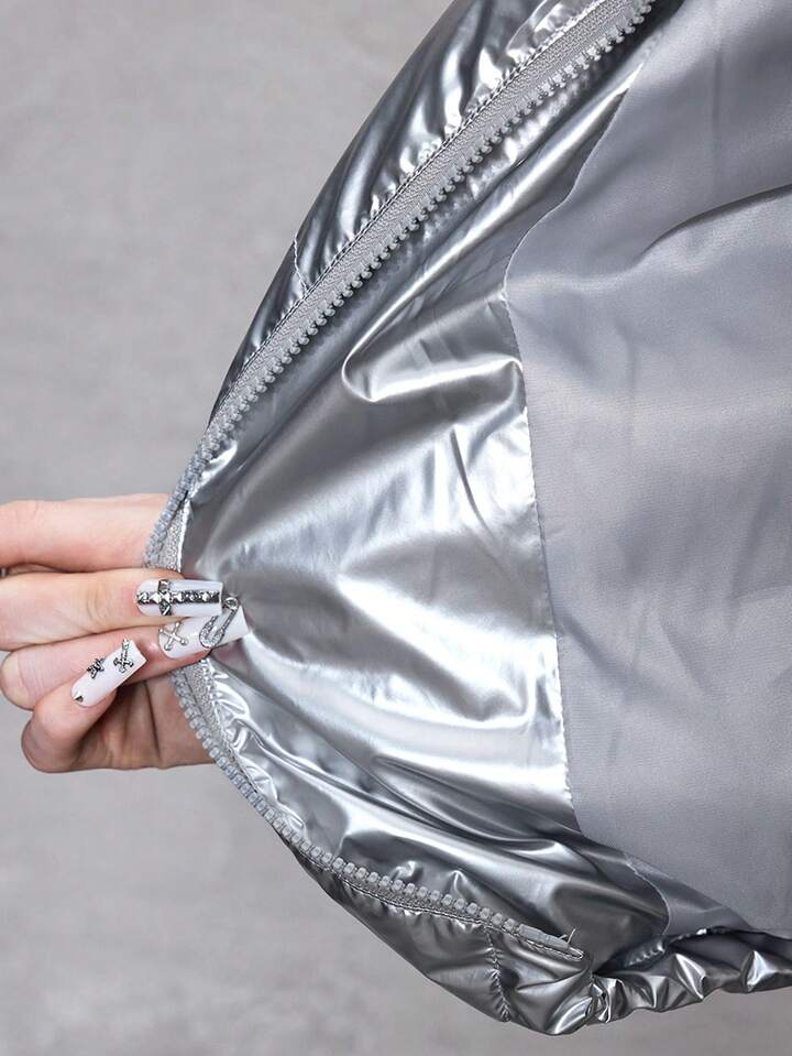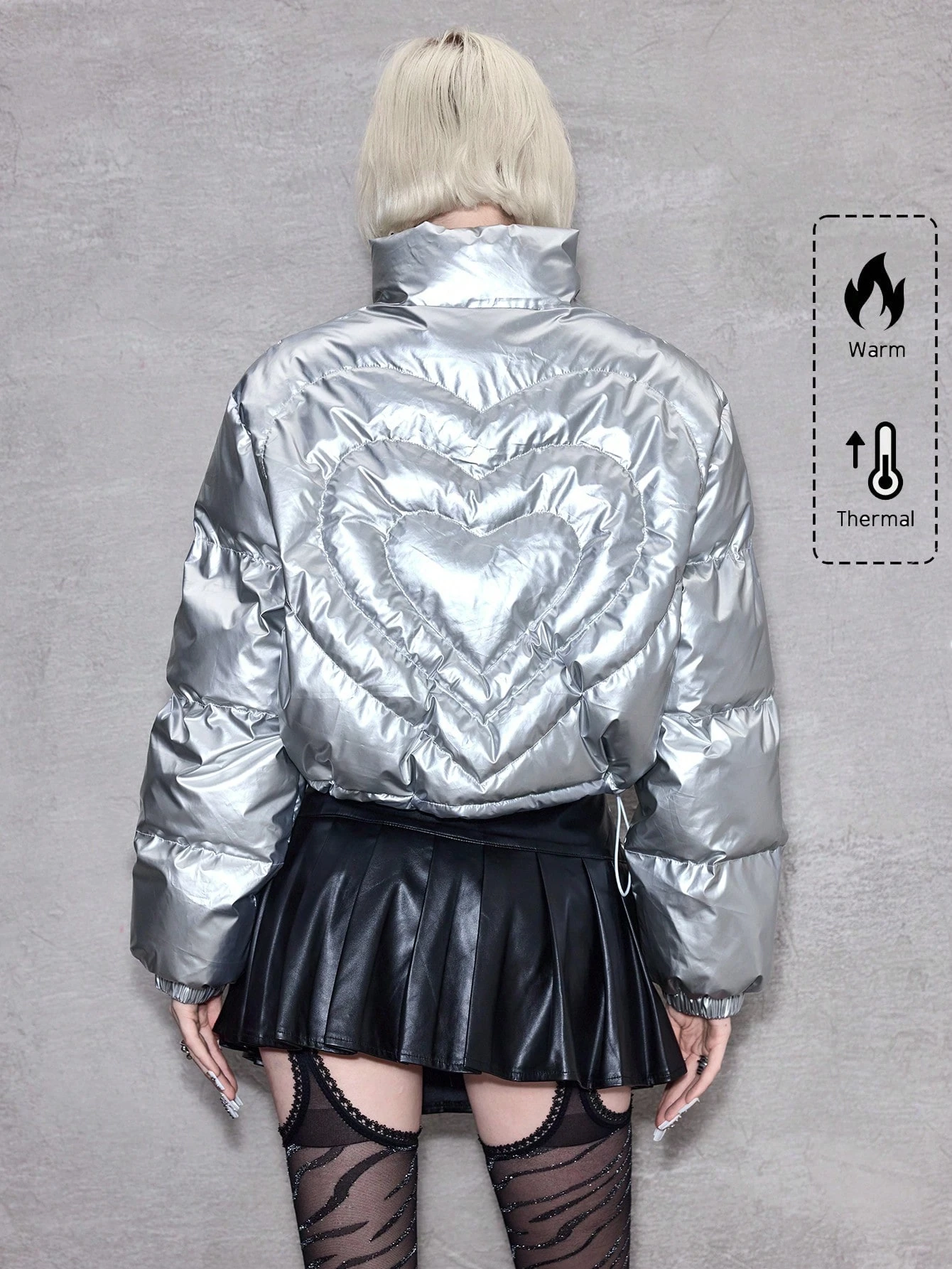 ROMWE Avant Cappotto imbottito corto argento con cuori trapuntati in stile Y2K per donna