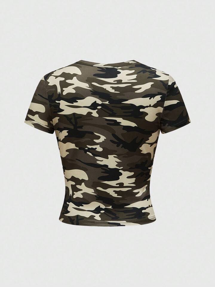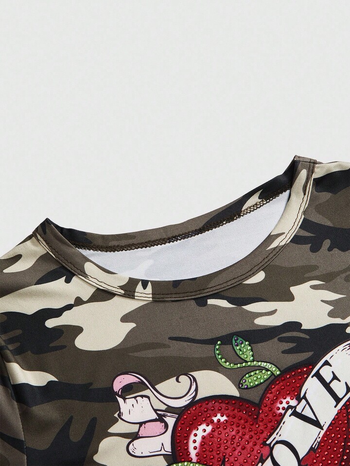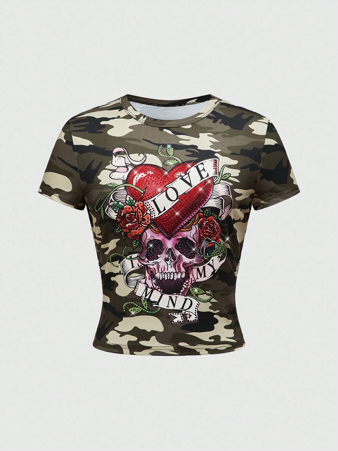 ROMWE Avant Maglietta aderente da donna con stampa a cuore scheletro rosa, strass e mimetica, stile Y2K Baddie, adatta per Ognissanti