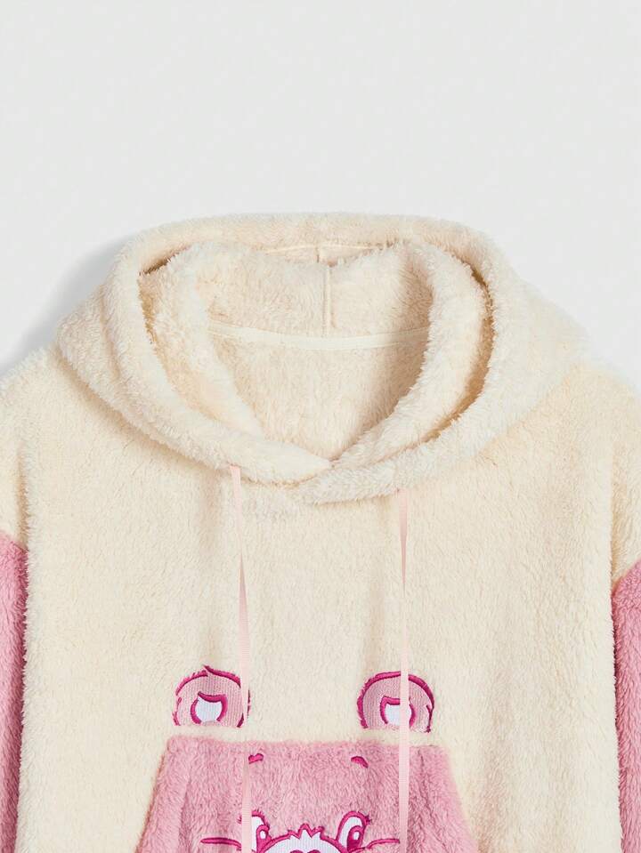 ROMWE X Care Bears Felpa con cappuccio morbida e larga da donna, con tasca a marsupio, orso carino ricamato, per l autunno/inverno