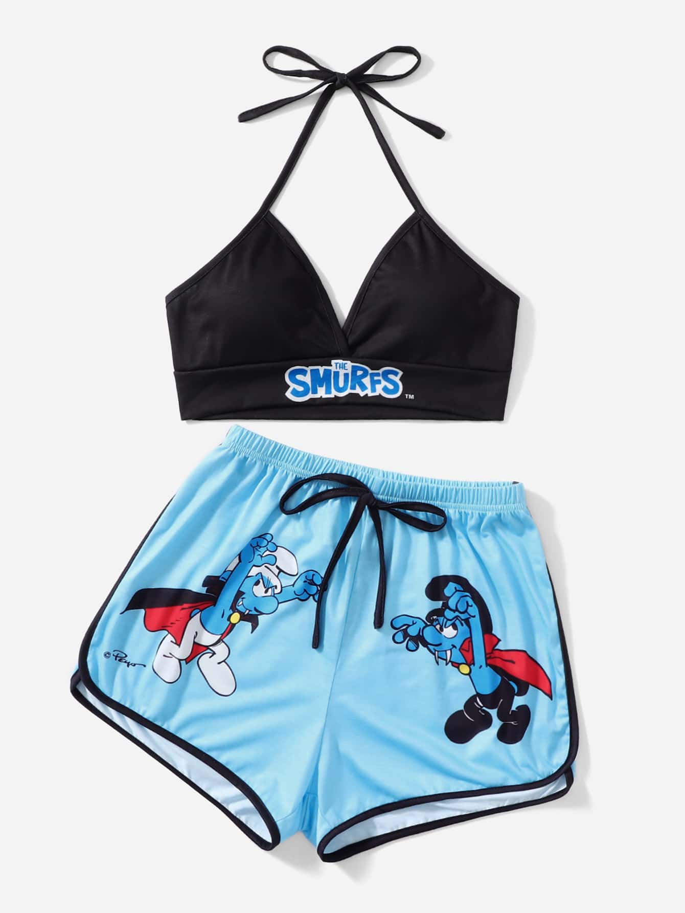 ROMWE X The Smurfs Set pigiama con grafica di cartone animato a lettere, per la scuola