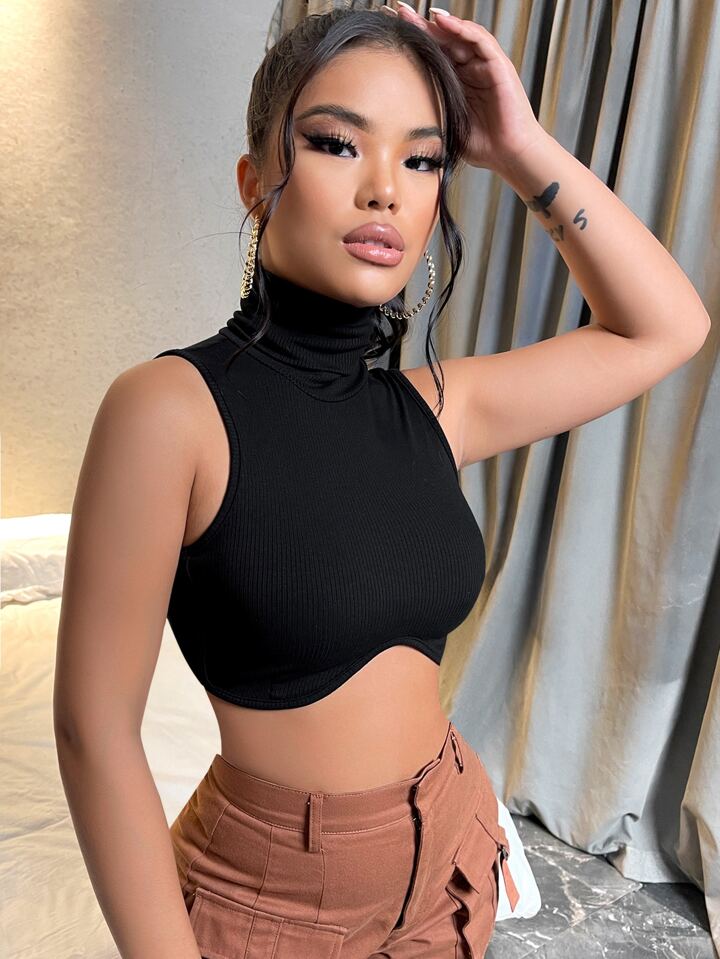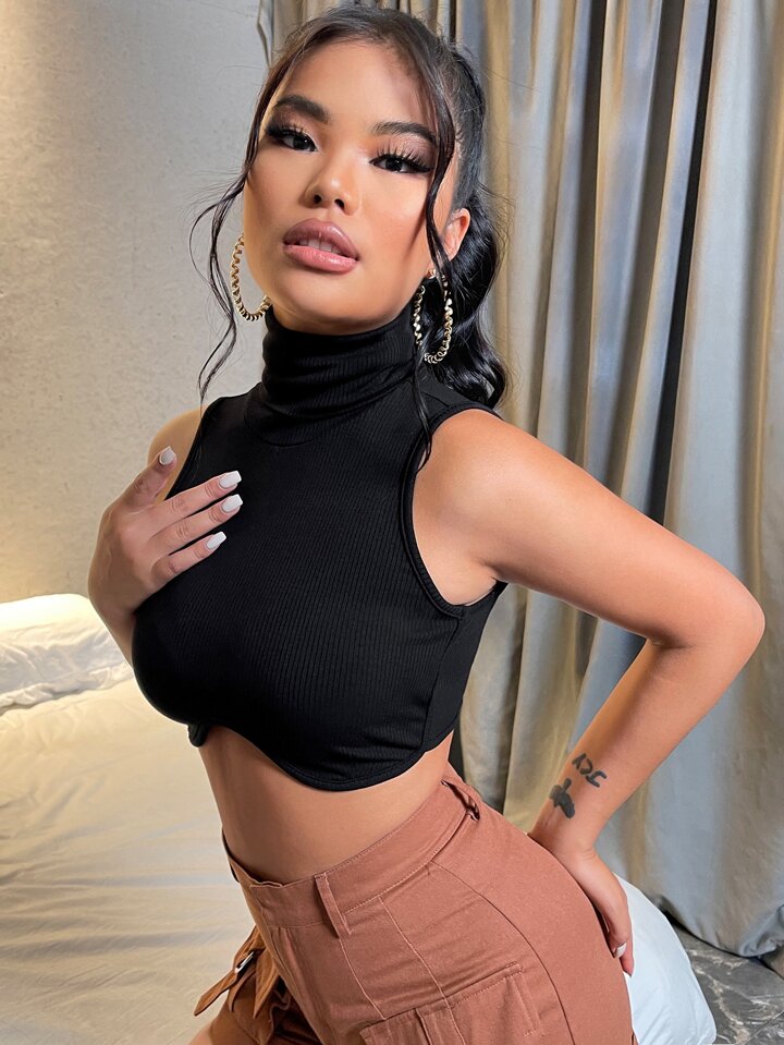 Canotta maglieria a coste monocolore collo arrotolato