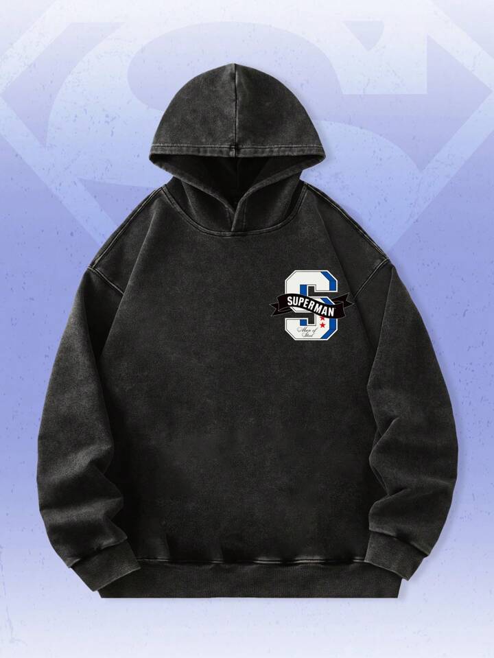 SUPERMAN X ROMWE Felpa con cappuccio da uomo vintage con stampa a lettere sbiadita e lavata