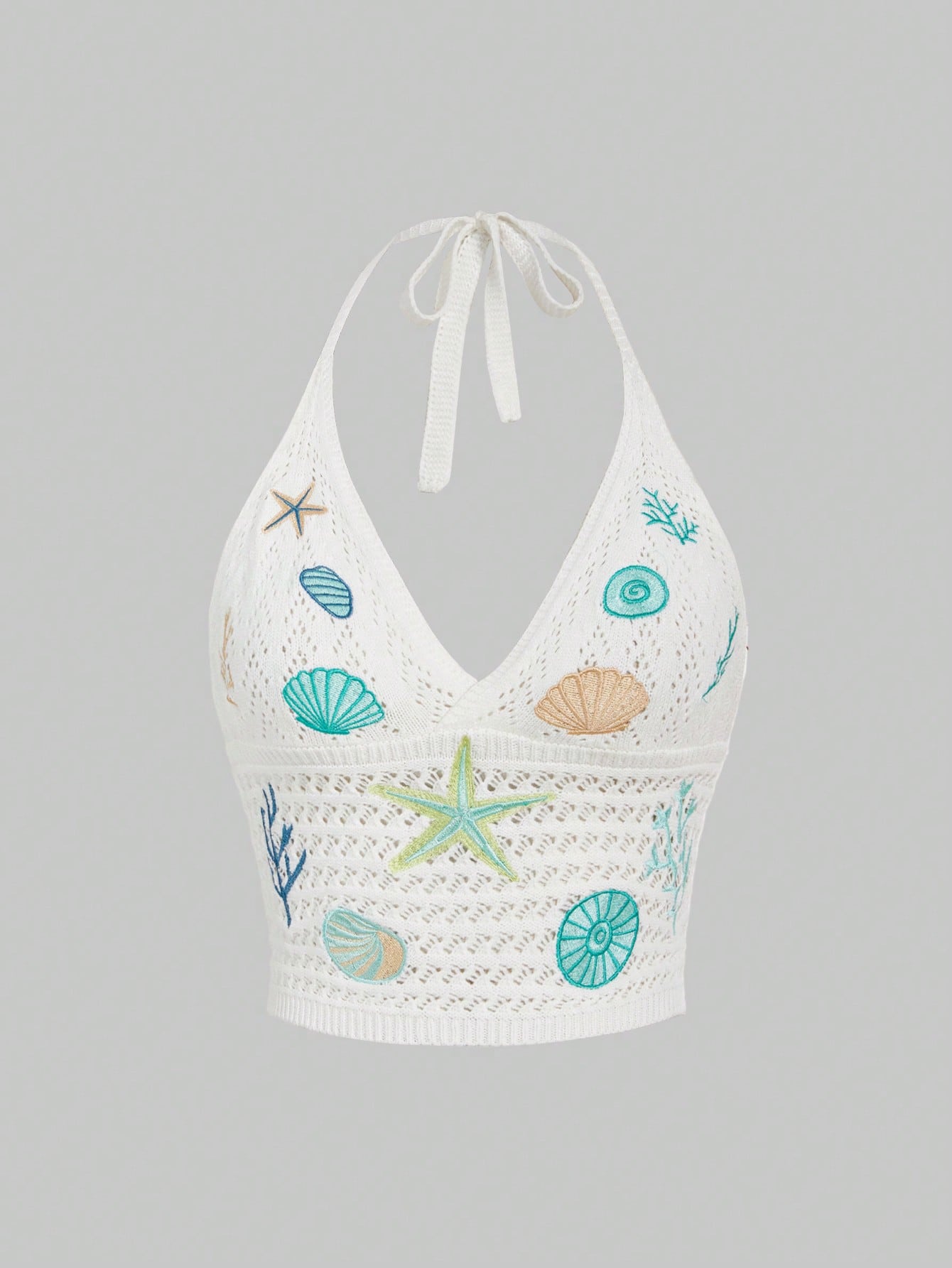 Top a canotta lavorato a maglia con ricamo di stelle marine e conchiglie, ideale per le vacanze al mare