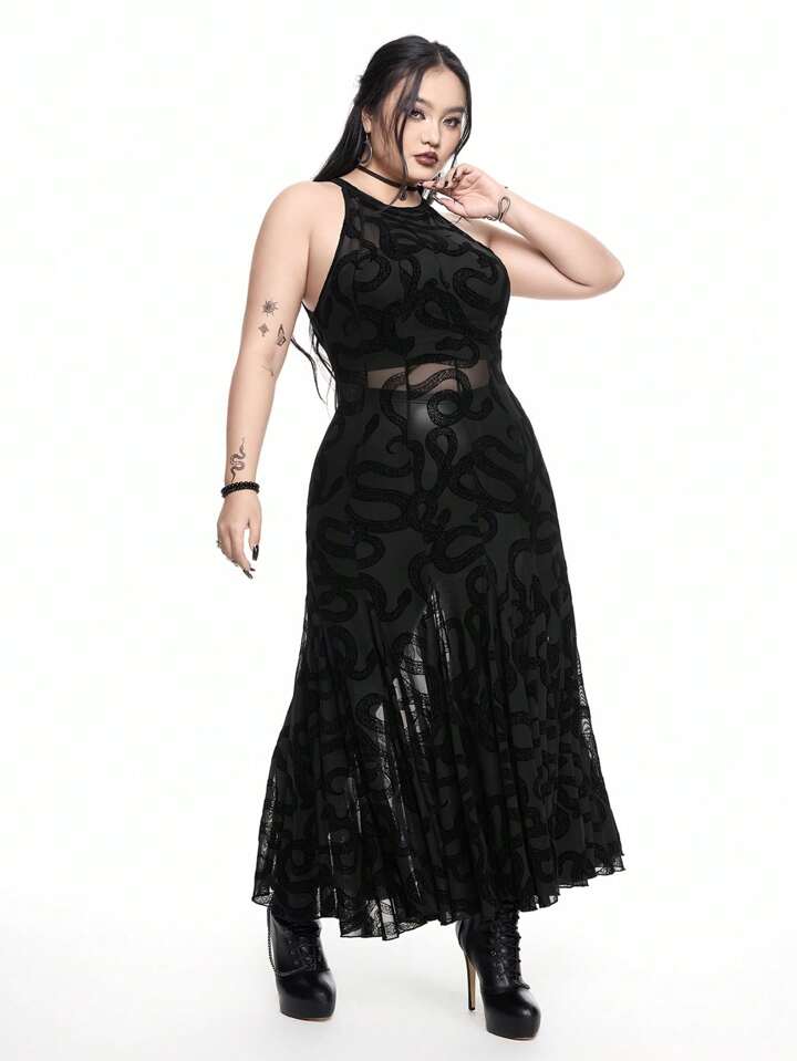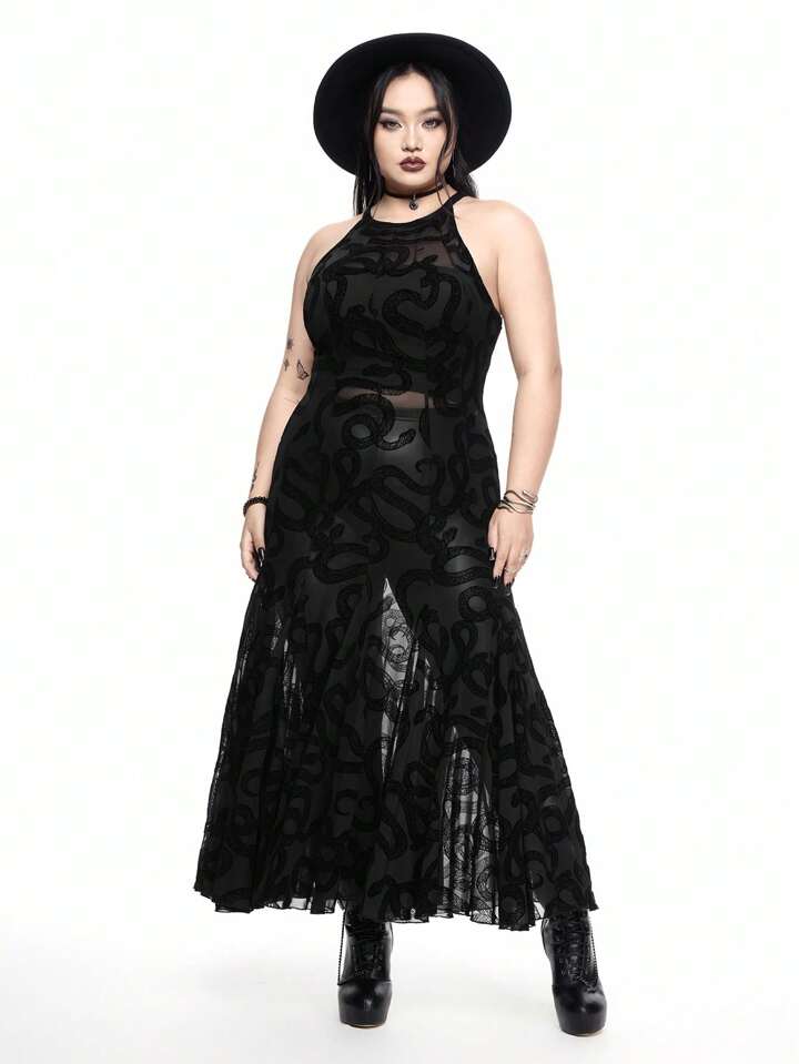 Goth Abito lungo sexy e gotico con taglio alla vita, in pizzo e rete trasparente, linea A, taglie curvy