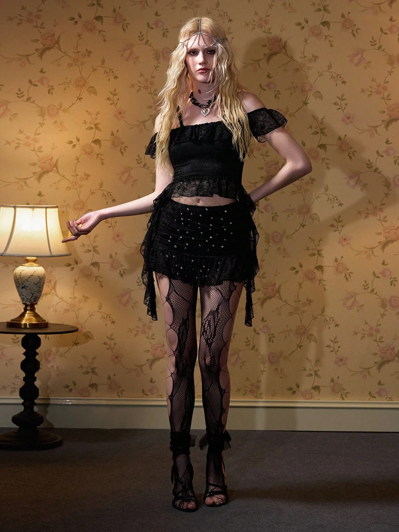 Minigonna aderente sexy con pieghe, pizzo e strass per donne