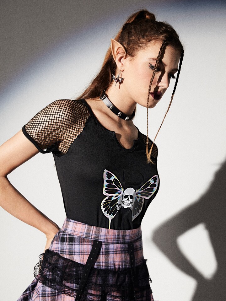 Maglietta teschio con stampa farfalla a rete da pesce contrasto