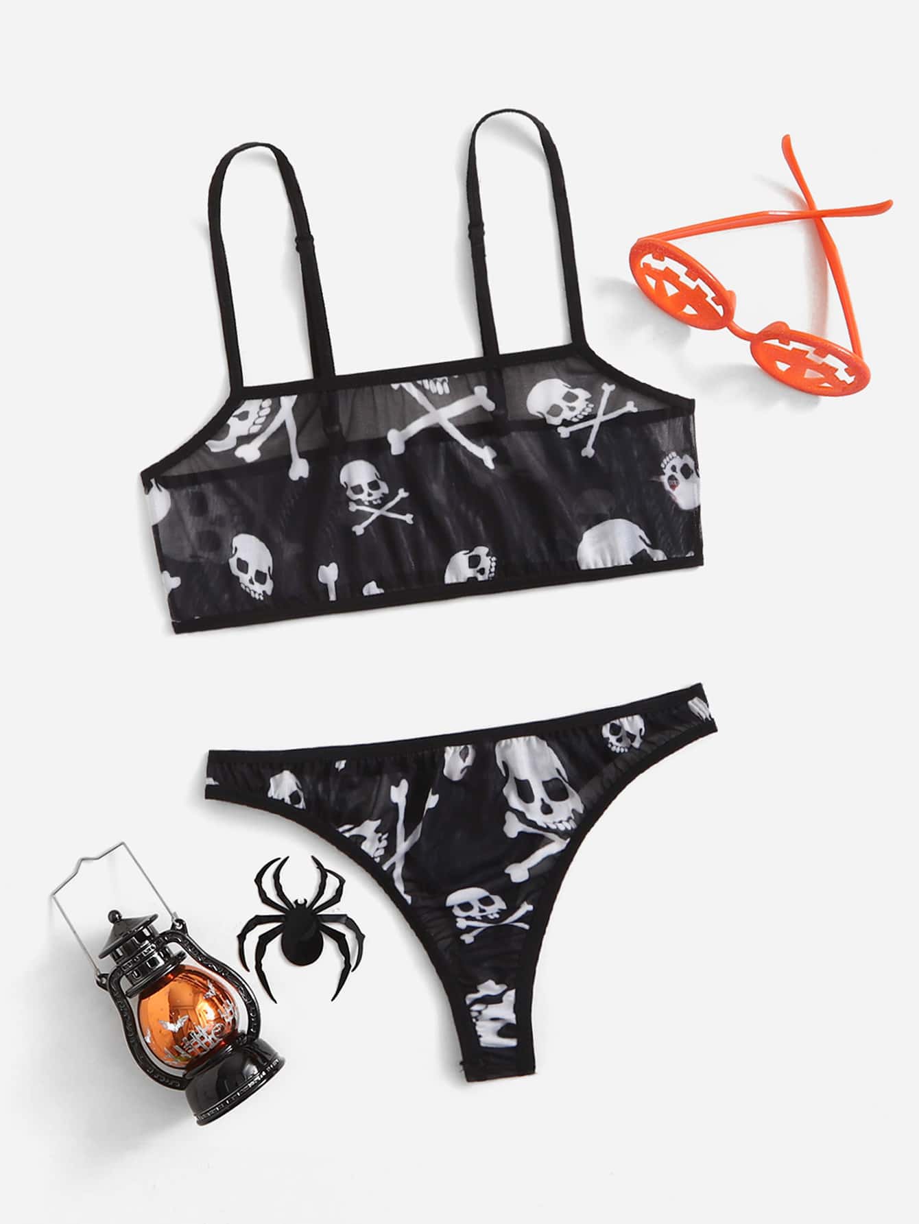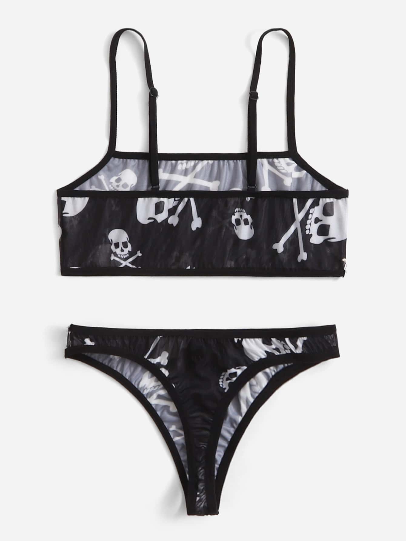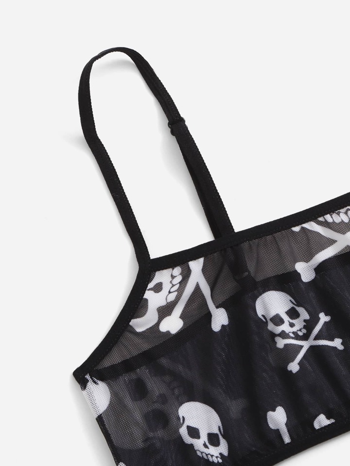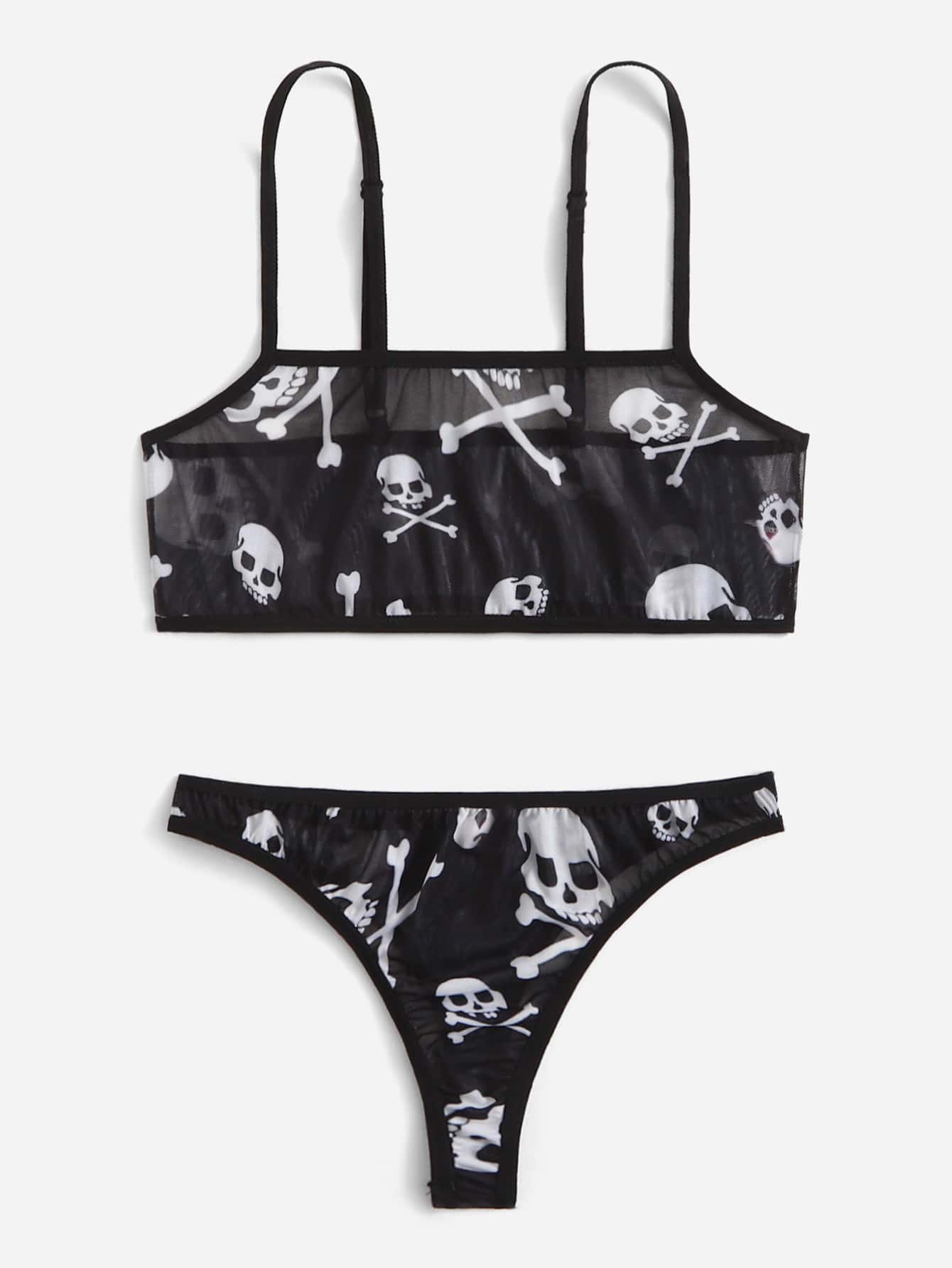 Set lingerie con stampa teschi in maglia trasparente