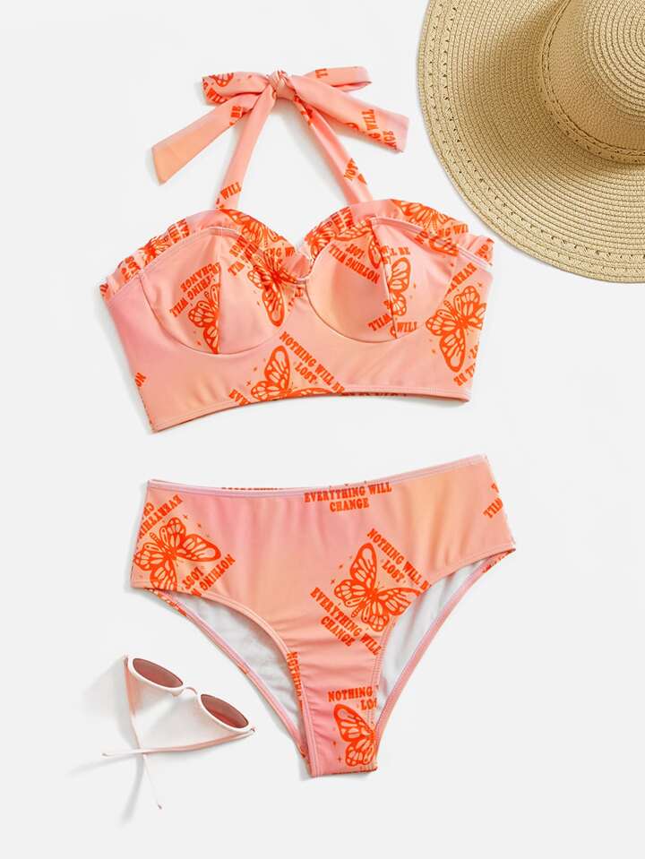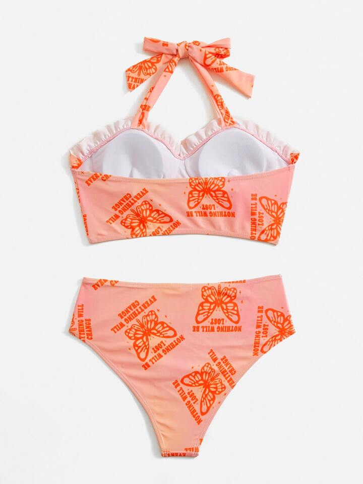 Bikini Halter Con Volant Grafico A Farfalla, Slogan