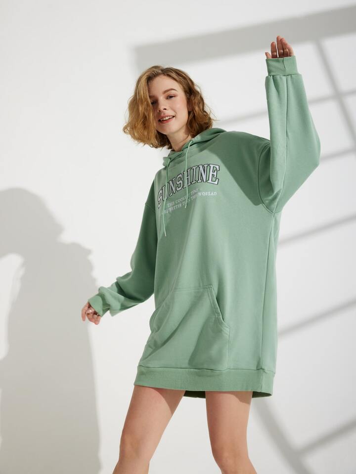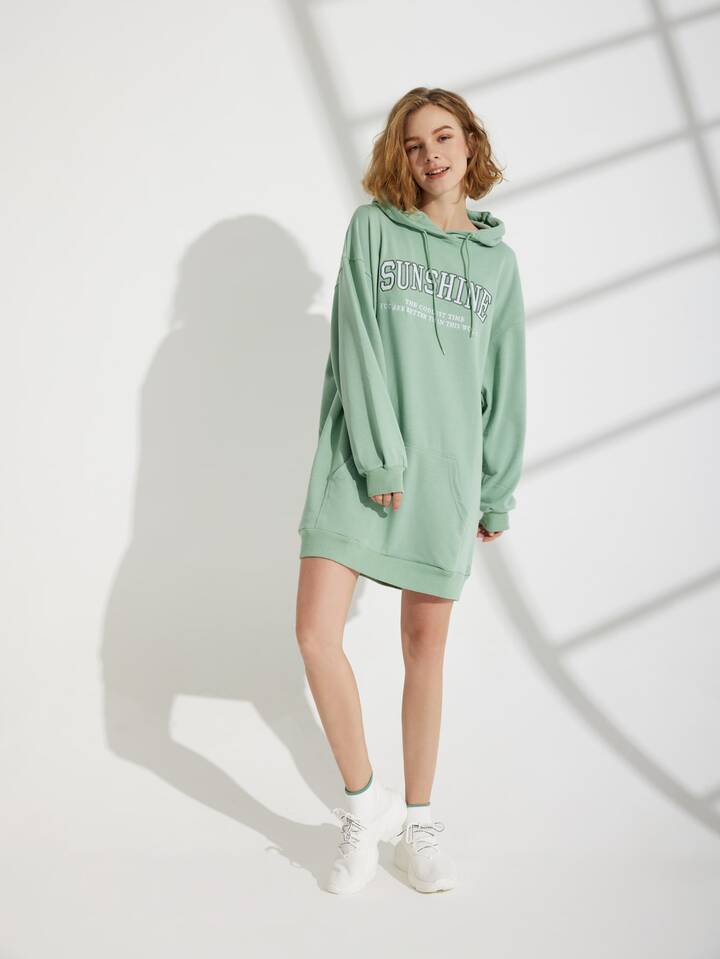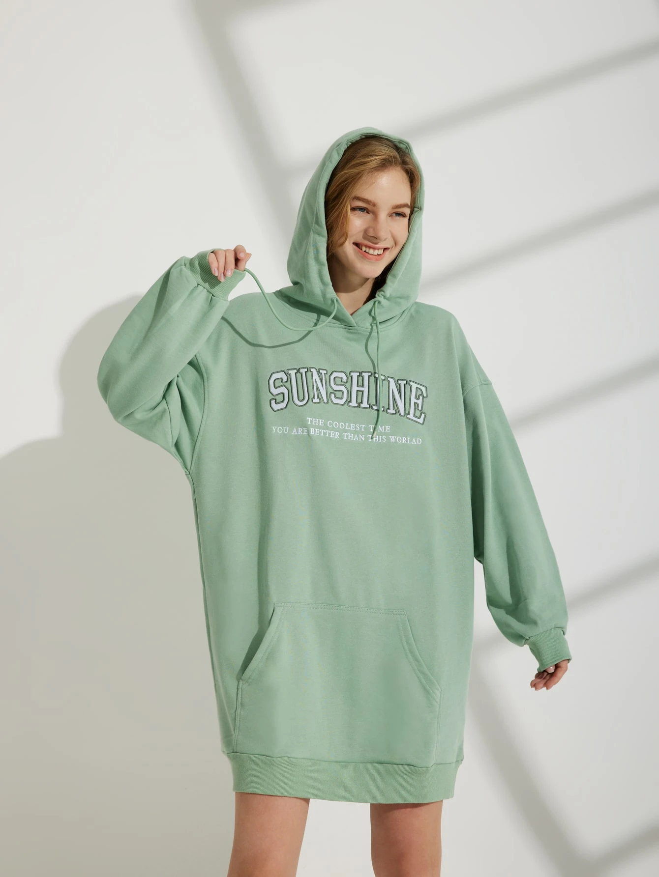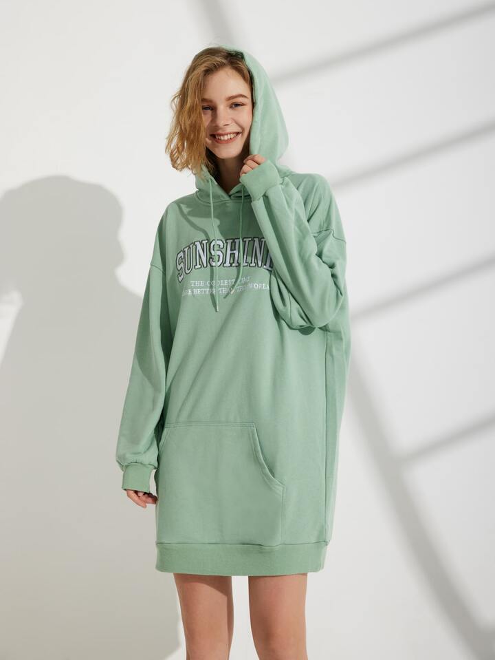 Abito felpa con cappuccio con spalle cadenti con ricamo di slogan