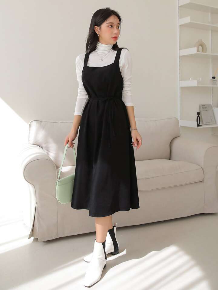 Vestito salopette senza top, con cintura, abbigliamento autunnale