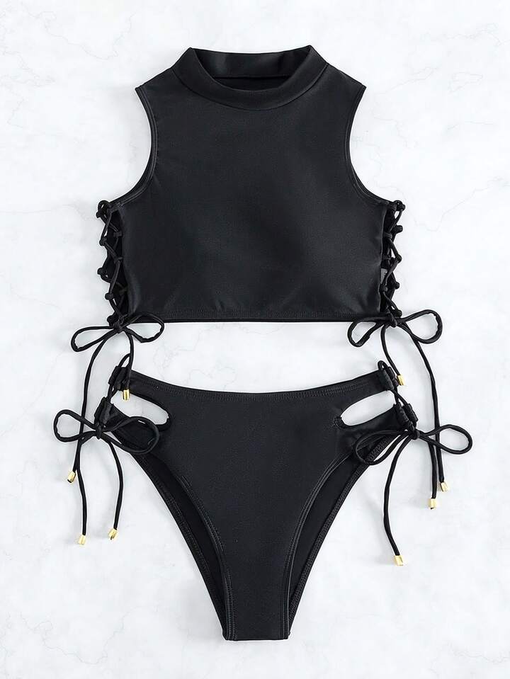 Set bikini solido con top a collo alto e culotte con fiocchi laterali, 2 pezzi, costume da bagno estivo