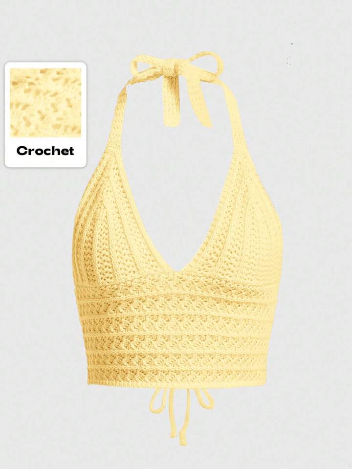 Top casual lavorato a maglia a uncinetto con collo alla halter e schiena scoperta, tinta unita