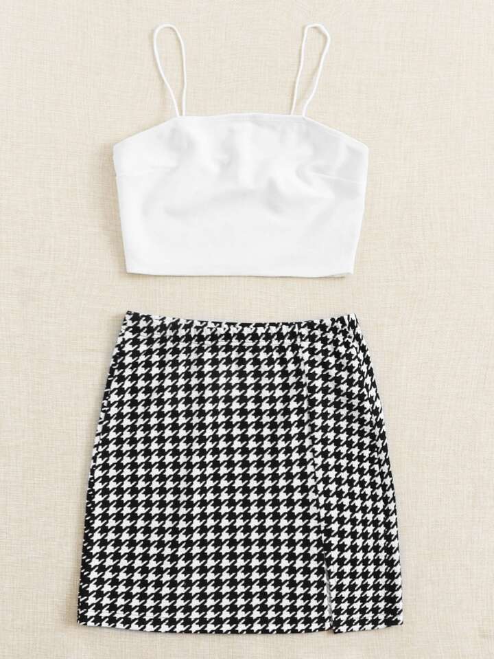 Set top crop con bretelle e Gonna a fessura pied de poule