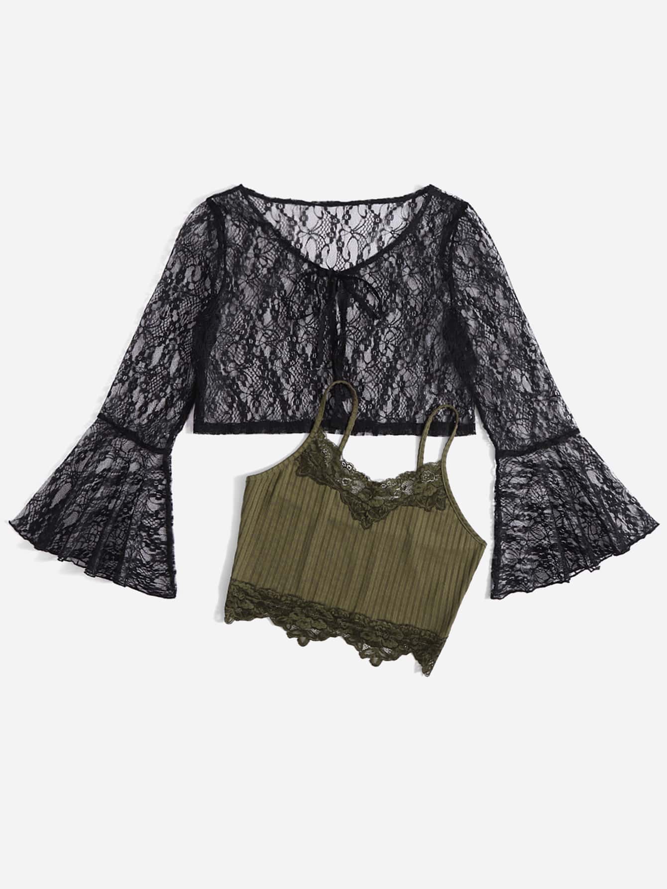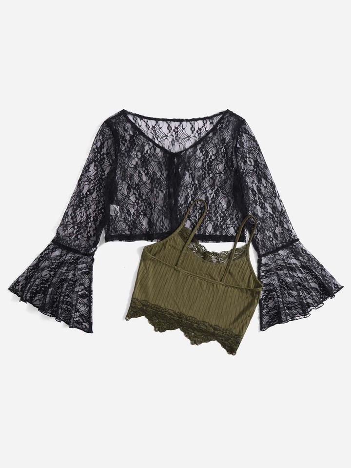 monocolore manica svasata Top & pizzo a contrasto Top con bretelle sottile