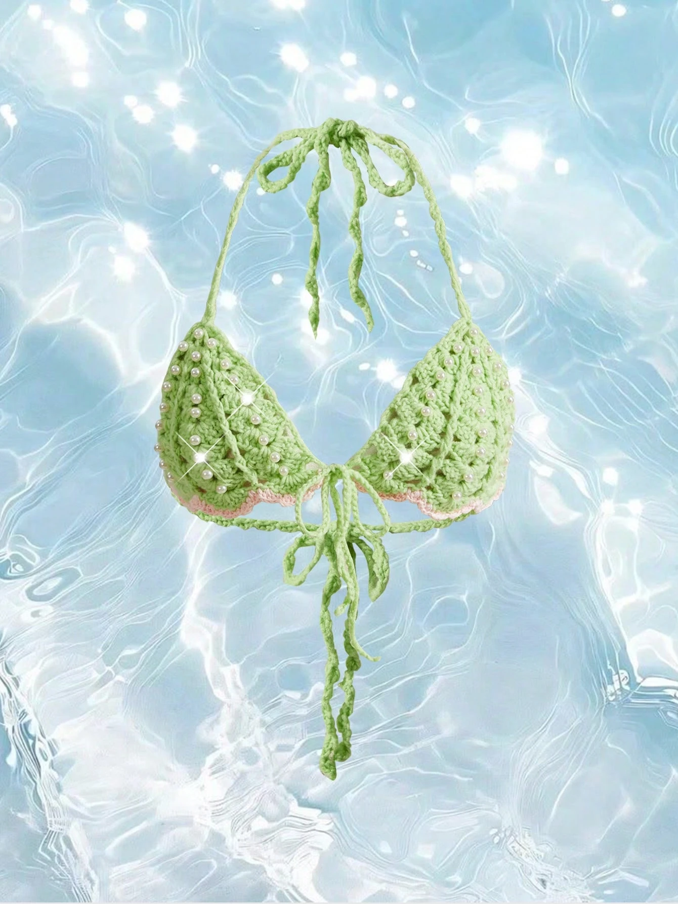 Top lavorato a maglia con fiocco frontale e finta perla, collo alto