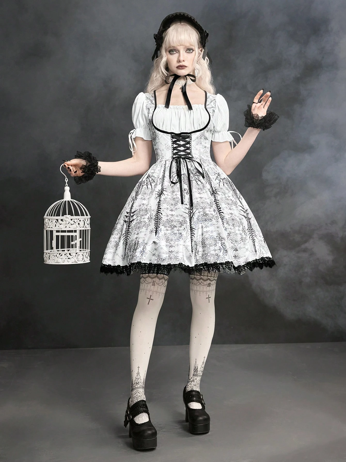 Goth Abito a ruota aderente con stampa scheletro e spine, con dettagli in pizzo a contrasto, stile Lolita gotica