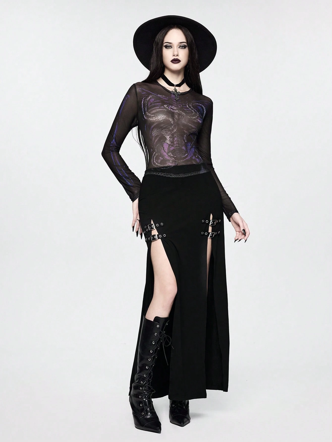 Goth Top corto trasparente con stampa di scheletro e serpente, stile gotico scuro
