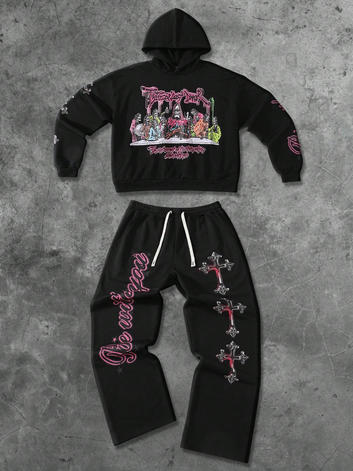 Street Life 2 pezzi Set di felpa con cappuccio e pantaloni della tuta con stampa gotica vintage, adatto per autunno/inverno, da uomo