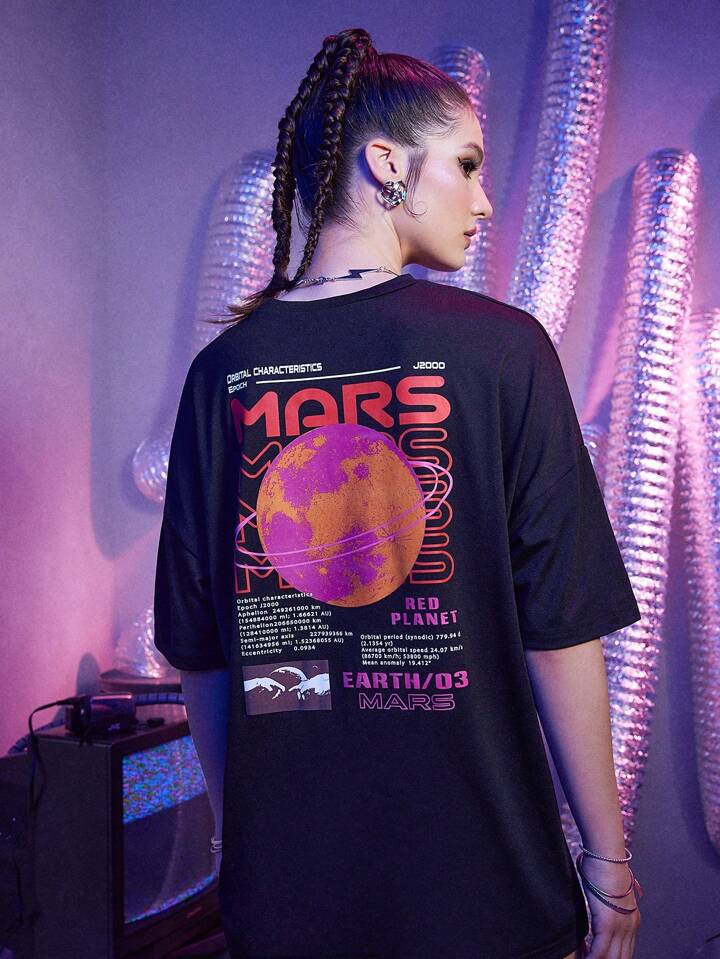 Street Life T-shirt oversize con grafica pianeta lettera, adatta per scuola, unisex